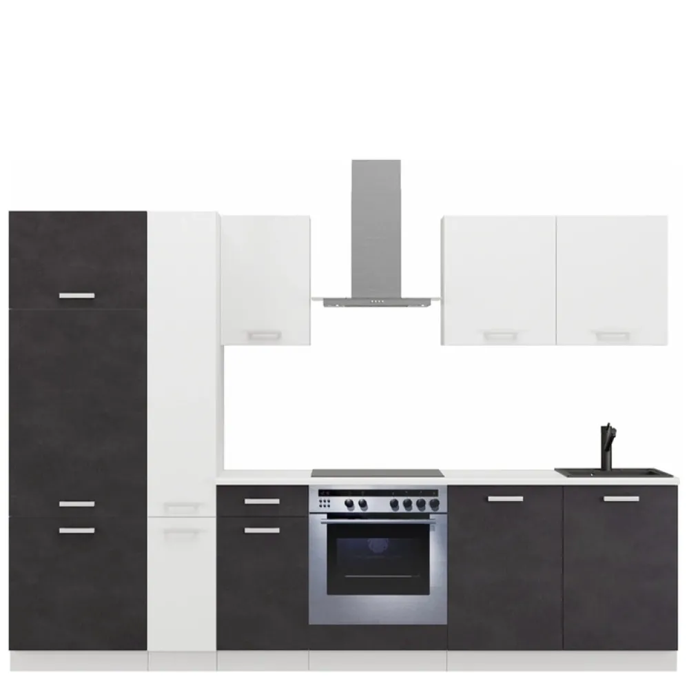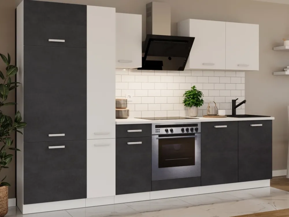 Całość dopełniona jest blatem i cokołem, dzięki którym zestaw prezentuje się kompletnie i elegancko. Tym samym otrzymujesz gotowy i spasowany zestaw kuchenny, nie musząc marnować czasu i nerwów na szukaniu tych elementów.