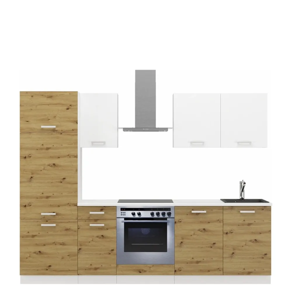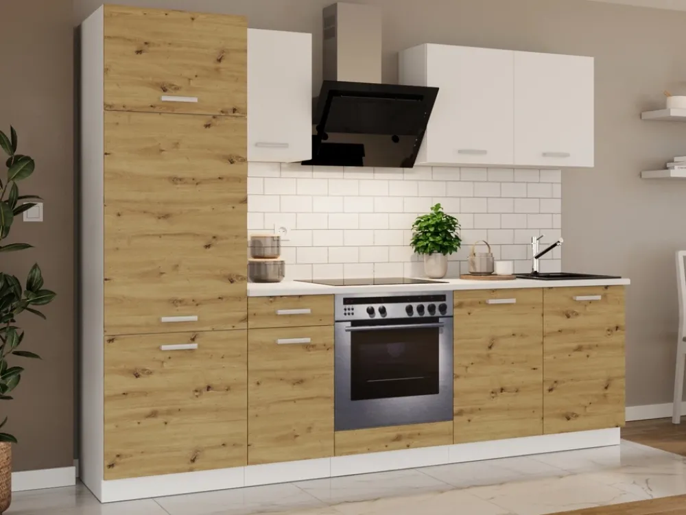 Zestaw obejmuje sześć szafek. W tym szafkę do zabudowy lodówki i piekarnika, szeroką szafkę pod zlewozmywak, oraz szafkę z szufladą. Całość dopełniają dwie szafki górne w kolorze białym. Każda szafka zaprojektowana jest tak, aby maksymalnie wykorzystać przestrzeń w Twojej kuchni.