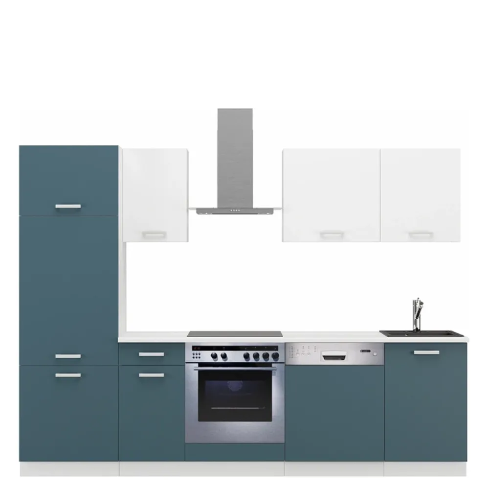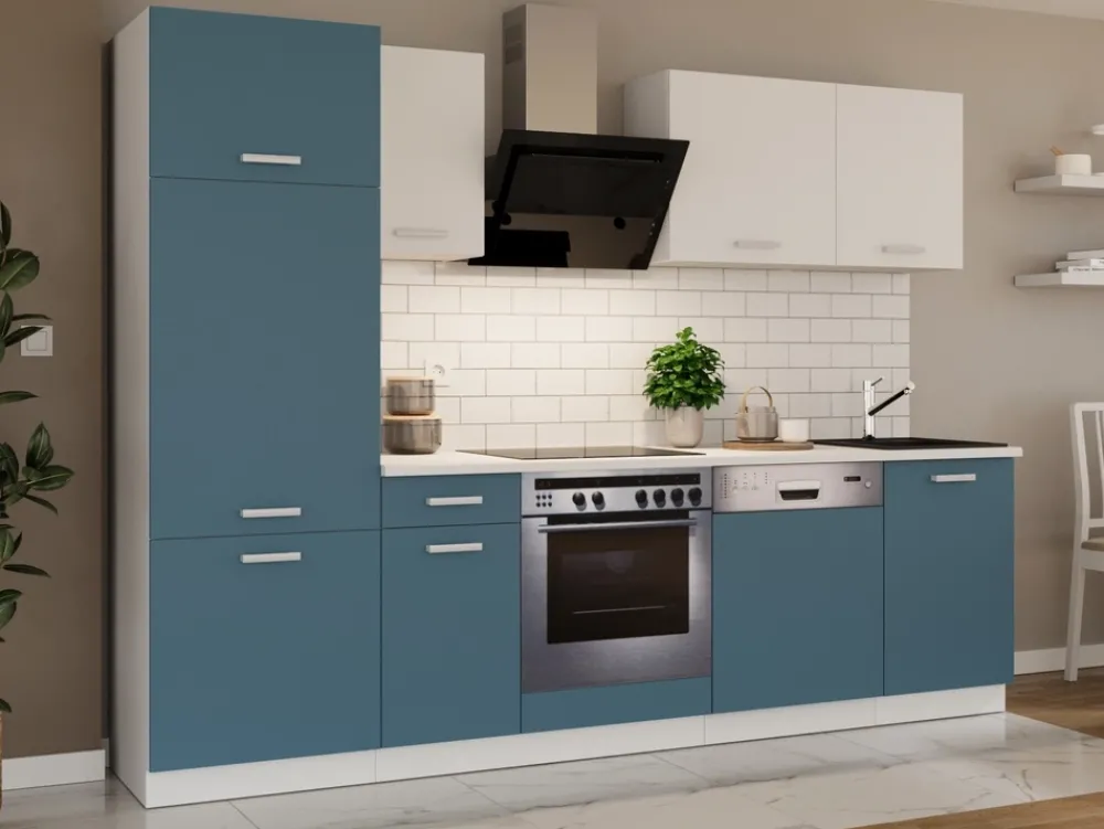 - Zestaw mebli kuchennych TONY wykonany jest z solidnej płyty laminowanej. Połączenie koloru skaggerak z bielą doda świeżości i charakteru. Srebrne uchwyty wykonane z tworzywa sztucznego. W zestawie blat oraz cokół. Szerokość 270 cm.