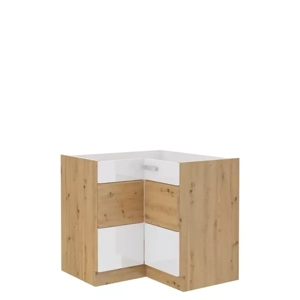 - Korpus: płyta laminowana 16mm Dąb Artisan. Front: – MDF 16mm Biały połysk / płyta laminowana Dąb Artisan