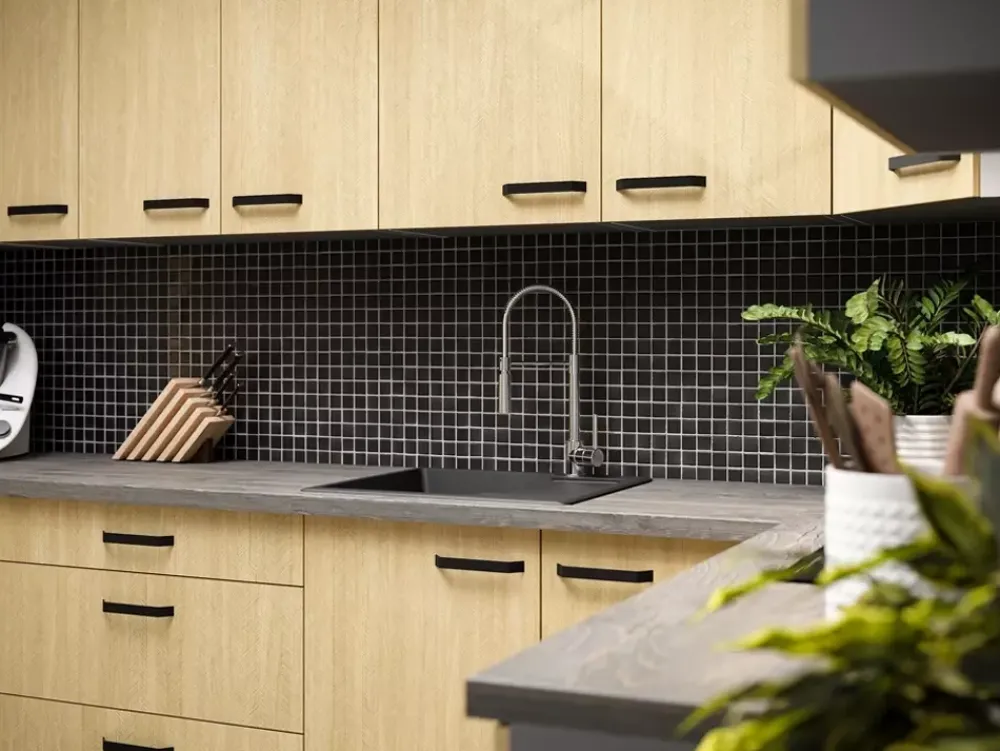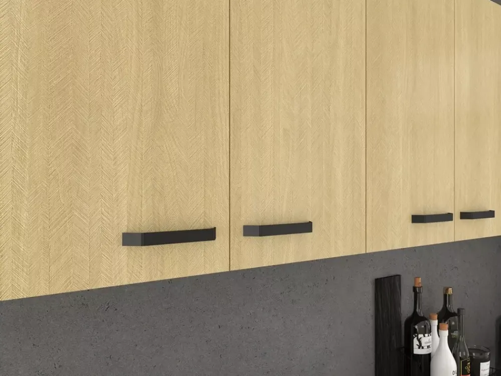Unikalne fronty w subtelnym wzorze jodełki, dodają ciepła i elegancji, a jednocześnie stanowią doskonałe tło dla różnych akcentów kolorystycznych i dekoracyjnych. Dodatkowo fronty świetnie kontrastują z korpusami w kolorze antracytu, który stanowi uzupełnienie wyjątkowego koloru jodełki scandi, oraz dodaje charakteru i nowoczesności każdej kuchni.