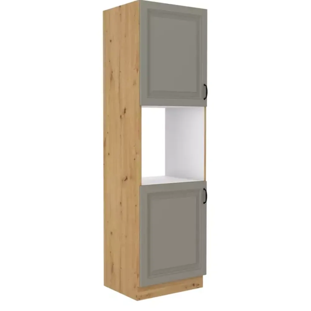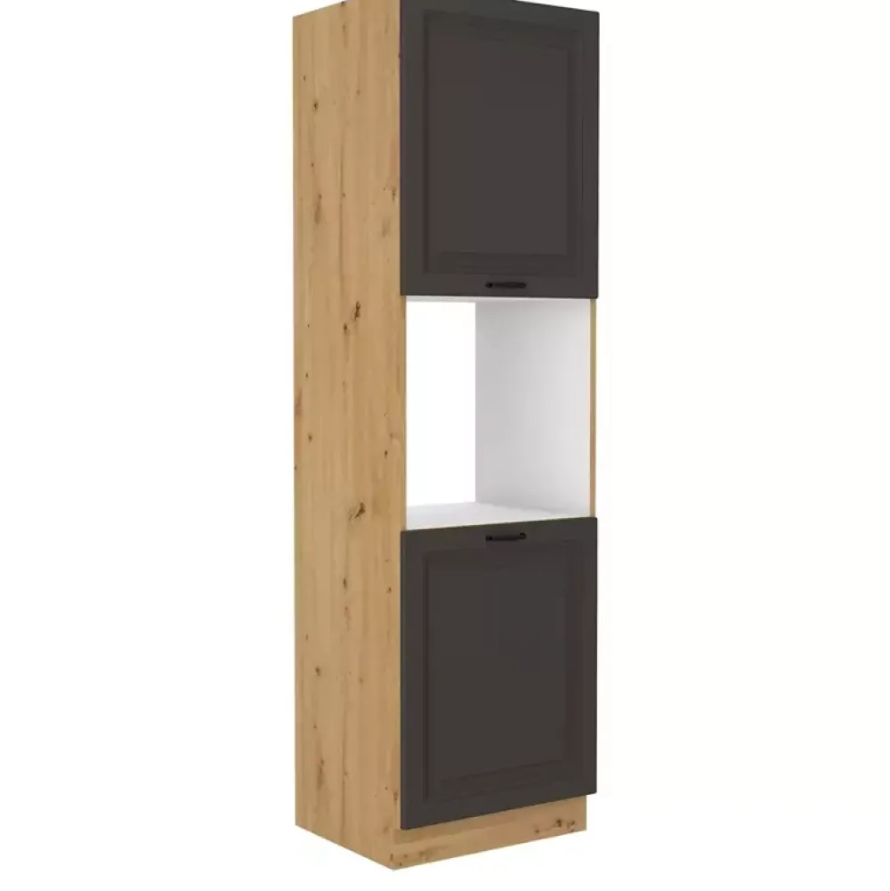 - Wysoka szafka pod zabudowę piekarnika ma 60 cm szerokości i została wyposażona w dwie półki, które dadzą ci cztery wnęki do przechowywania.