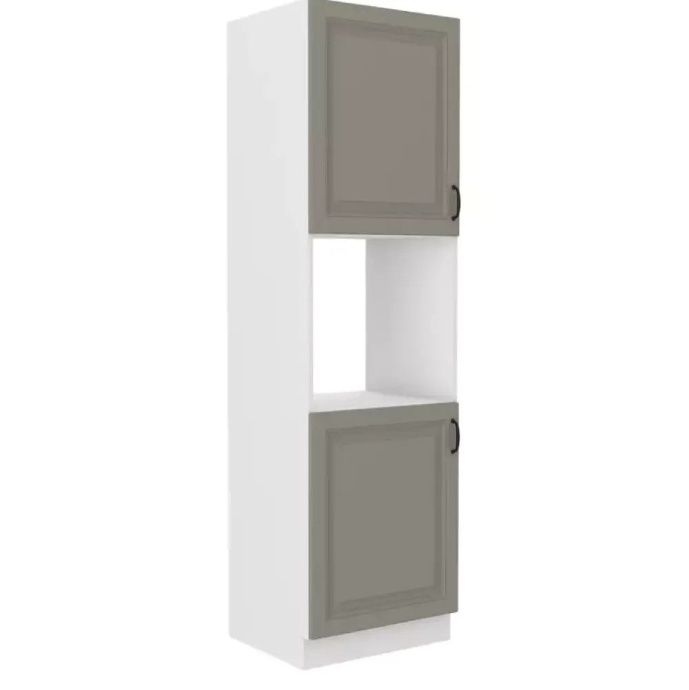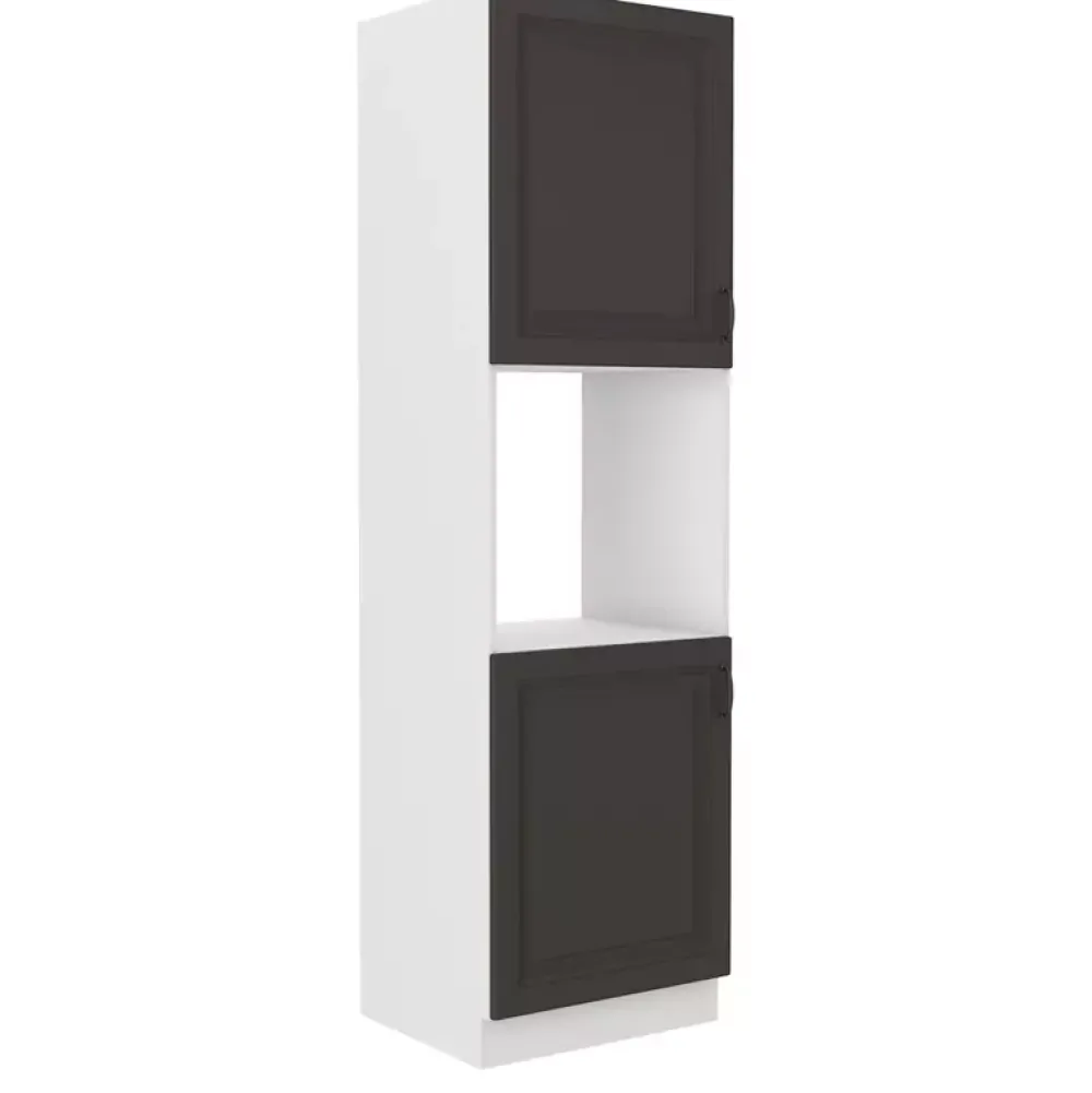 Wysoka szafka pod zabudowę piekarnika ma 60 cm szerokości. W górnej części szafki znajdują się dwie wnęki, oddzielone jedną półką i tak samo wygląda to w dolnej części tej dużej szafki pod zabudowę. Zawiasy posiadają mechanizm cichego domykania, co gwarantuje delikatne zamykanie i otwieranie frontów. Szafka opiera się na cokole w kolorze korpusu. Wybierz odpowiadający Ci kolor korpusu i frontów, klikając przycisk „Dopasuj i kup”.