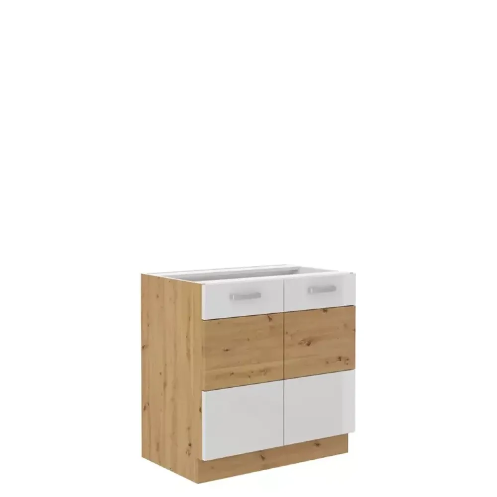 - Dwudrzwiowa szafka kuchenna stojąca o szerokości 80 cm wyposażona została w półkę