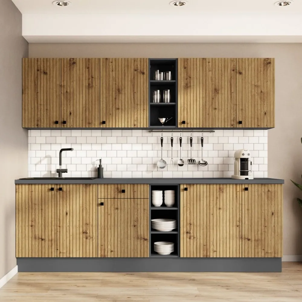 Starannie frezowane fronty mebli ALEPPO, wykonane z najwyższej jakości płyty MDF, posiadają subtelną, lamelową strukturę, przyciągającą wzrok, podkreślając jednocześnie minimalistyczny charakter mebli. W połączeniu z metalowymi uchwytami fronty zapewniają elegancki, nowoczesny wygląd, który łatwo dostosować do każdej przestrzeni kuchennej.