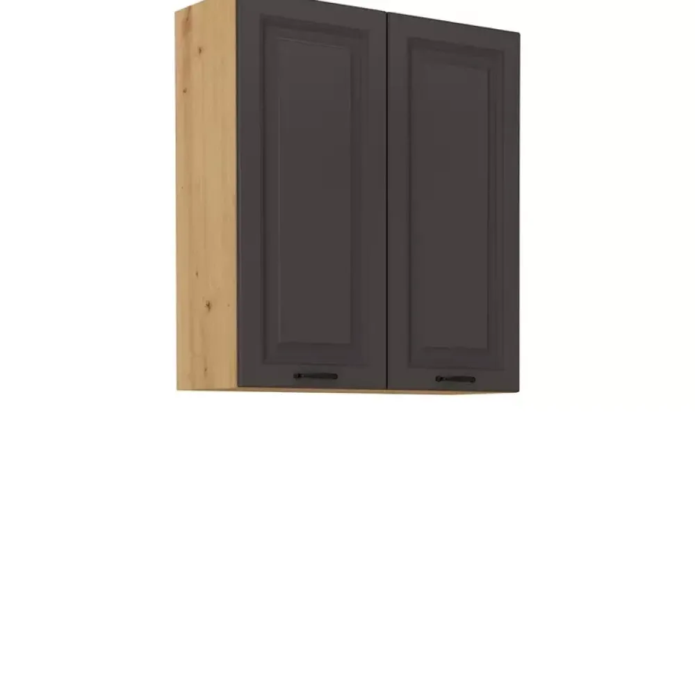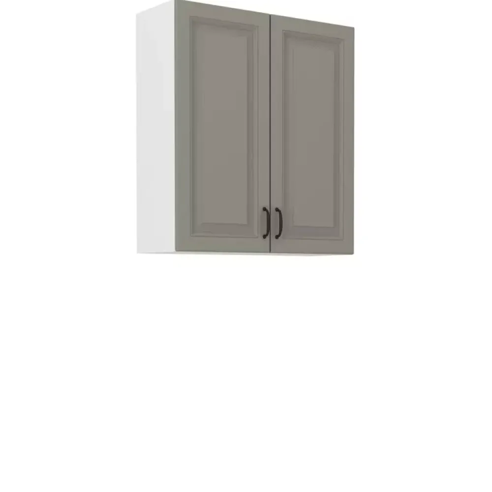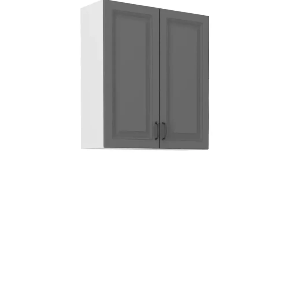 - Wisząca szafka kuchenna dwudrzwiowa o szerokości 80 cm i wysokości 90 cm została wyposażona w trzy półki.