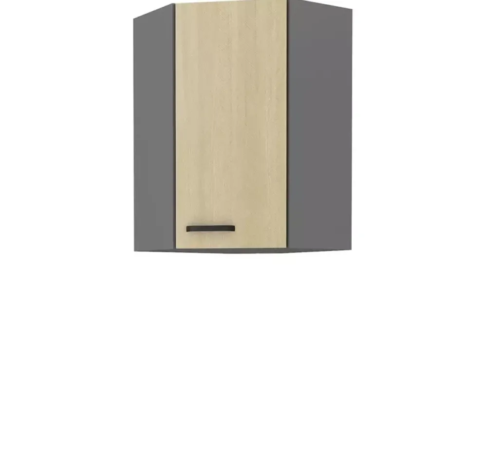 - Narożna górna szafka kuchenna z dwiema półkami SUNSHINE to połączenie estetyki i funkcjonalności, idealna dla współczesnych wnętrz. Wyjątkowy wzór jodełki na frontach z cichym domykiem dodaje charakteru, a metalowe uchwyty podkreślają jej nowoczesny styl.
