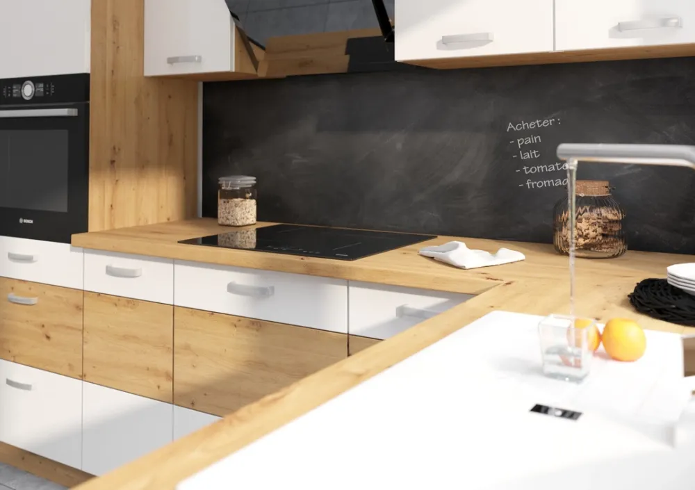 - Korpus: płyta laminowana 16mm Dąb Artisan. Front: – MDF 16mm Biały połysk / płyta laminowana Dąb Artisan