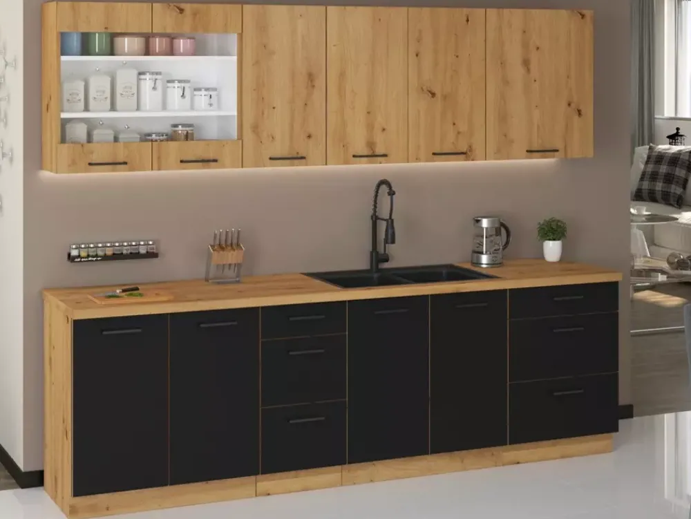 Uniwersalny charakter nadadzą czarne matowe uchwyty. Szafki wiszące w kolorze dąb artisan rozjaśnią wnętrze i nadadzą mu przytulnego klimatu, a szafki stojące powstałe z połączenia dębu artisan i czarnego matu nadadzą nowoczesności i elegancji.