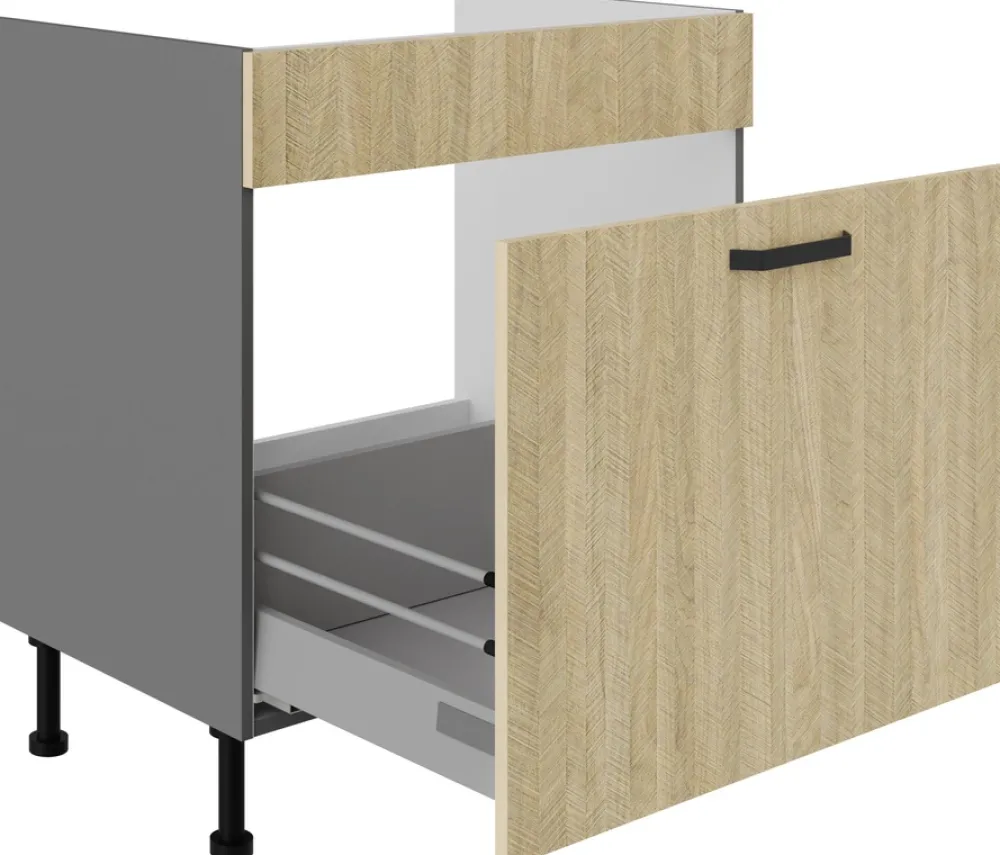 Unikalne fronty w subtelnym wzorze jodełki, dodają ciepła i elegancji, a jednocześnie stanowią doskonałe tło dla różnych akcentów kolorystycznych i dekoracyjnych. Dodatkowo fronty świetnie kontrastują z korpusami w kolorze antracytu, który stanowi uzupełnienie wyjątkowego koloru jodełki scandi, oraz dodaje charakteru i nowoczesności każdej kuchni.