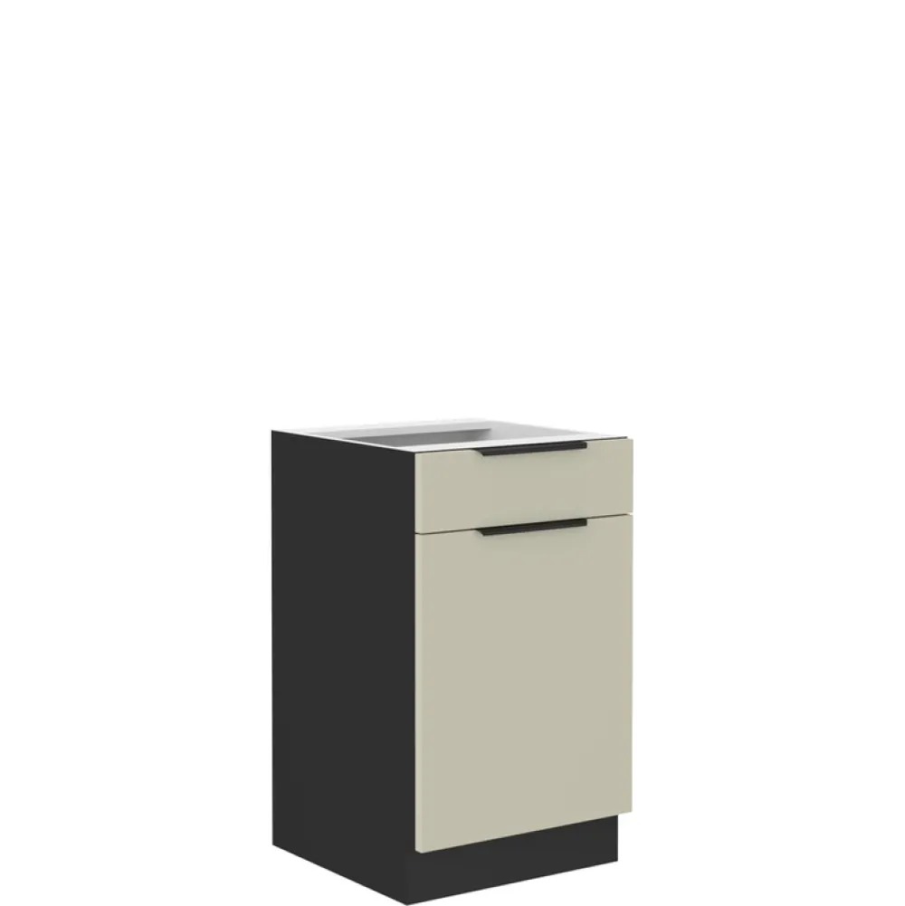 - Kolekcja mebli kuchennych ANES wyróżnia się frontami w kolorze kaszmiru, oraz systemem cichego domyku frontów i szuflad. Uchwyty w kolorze czarnym wykonano z aluminium. Przestronna szuflada PREMIUM BOX. Nóżki w formie ślizgów.