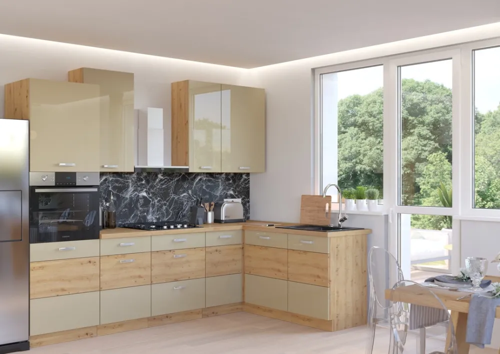 - Korpus: płyta laminowana 16mm Dąb Artisan. Front: – MDF 16mm Cappucino połysk / płyta laminowana Dąb Artisan