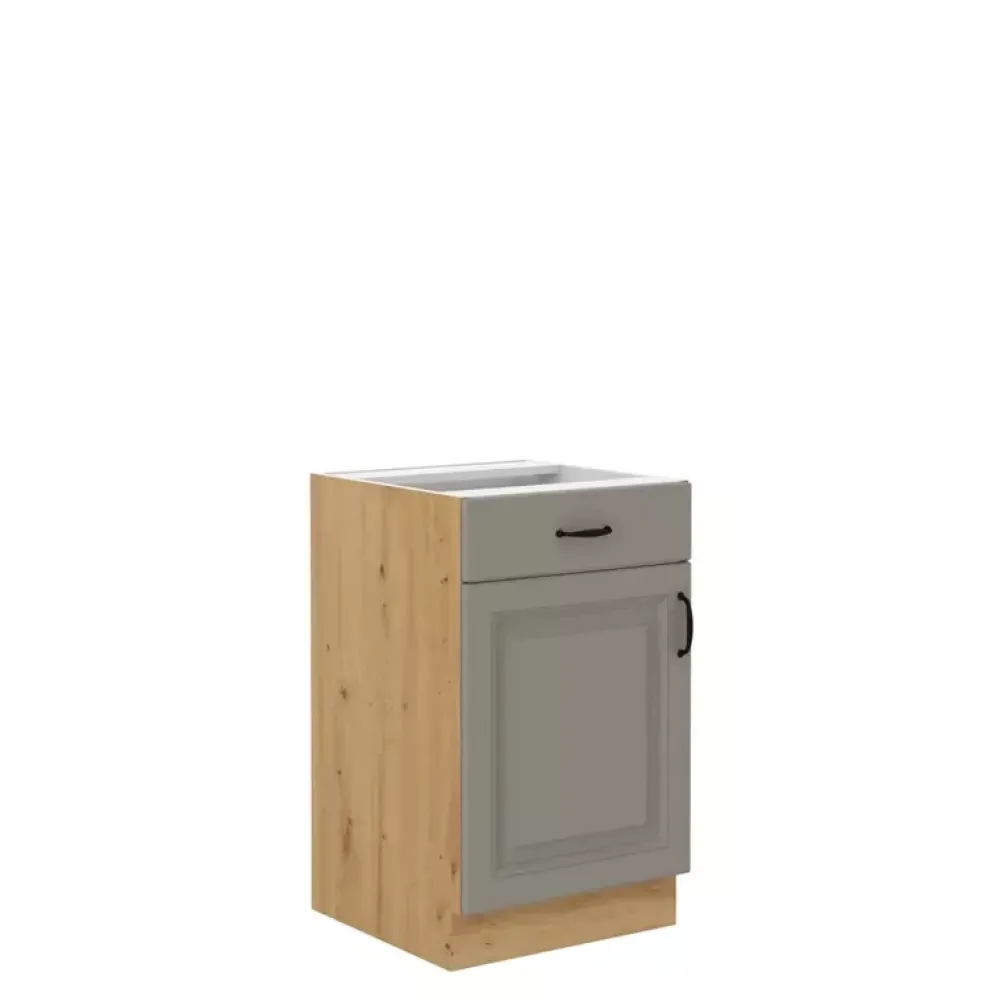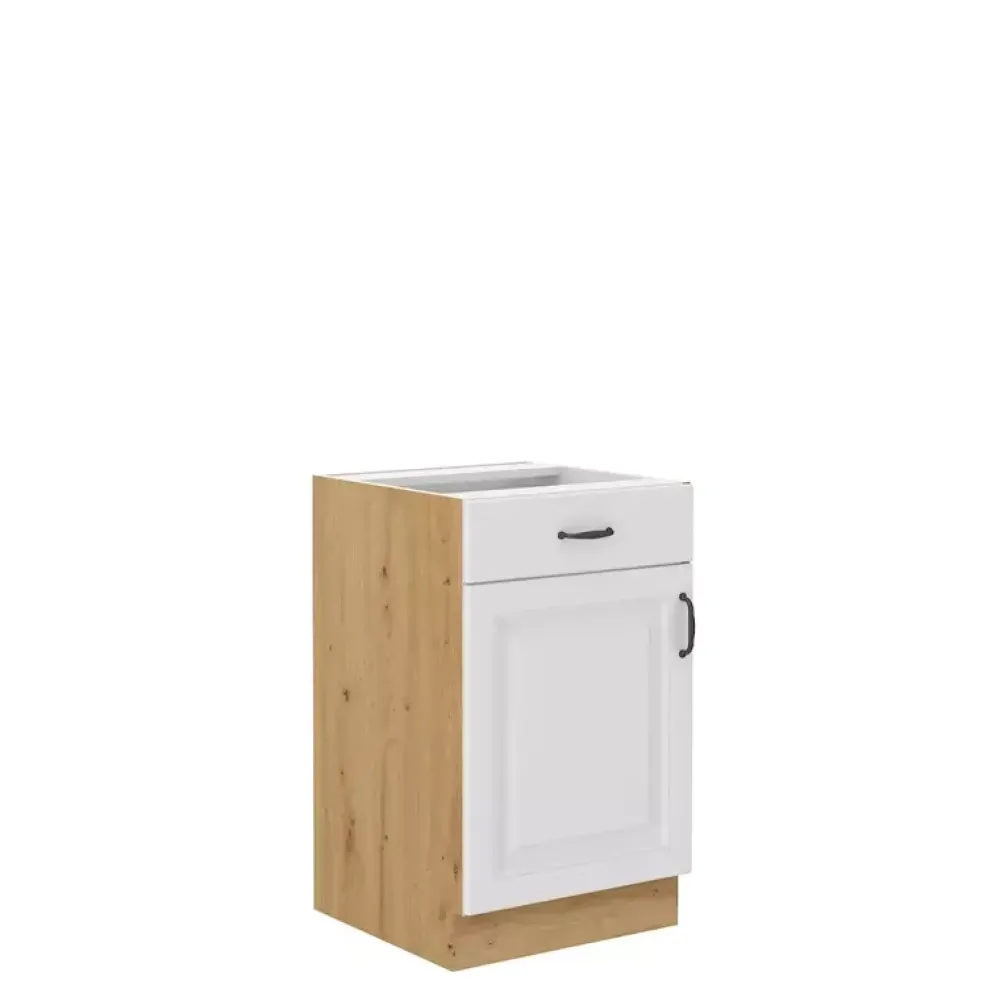 Szafka kuchenna ma 50 cm szerokości i wyposażono ją w jedną szufladę oraz jedną półkę. Zarówno zawiasy, jak i prowadnice posiadają mechanizm cichego domykania, co gwarantuje delikatne zamykanie i otwieranie frontów. Szafka opiera się na cokole w kolorze korpusu. Wybierz odpowiadający Ci kolor korpusu i frontów, klikając przycisk „Dopasuj i kup”.