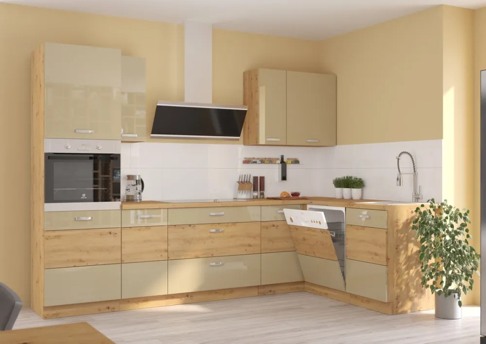 - Korpus: płyta laminowana 16mm Dąb Artisan. Front: – MDF 16mm Cappucino połysk / płyta laminowana Dąb Artisan