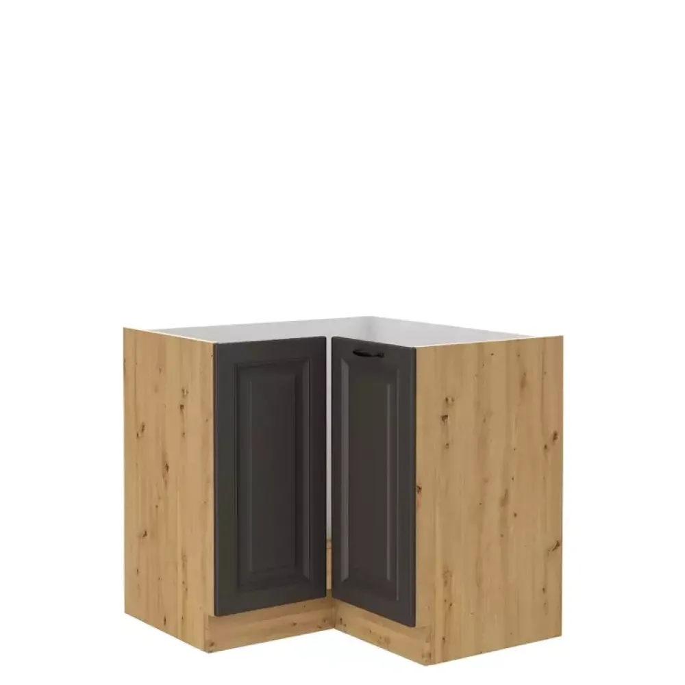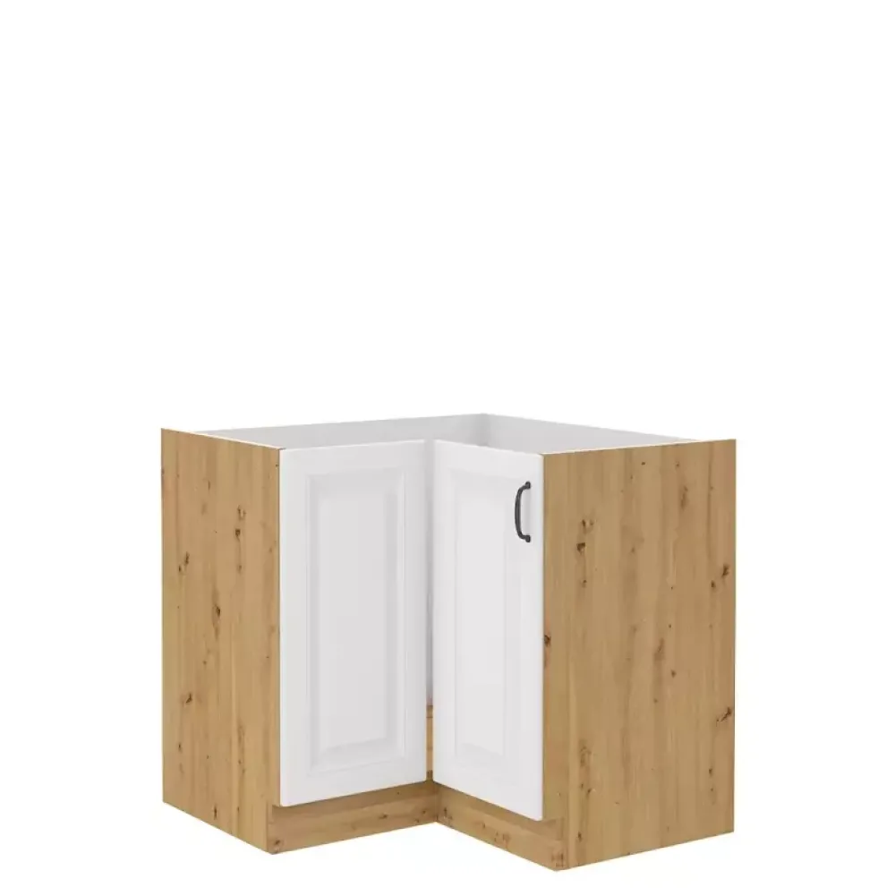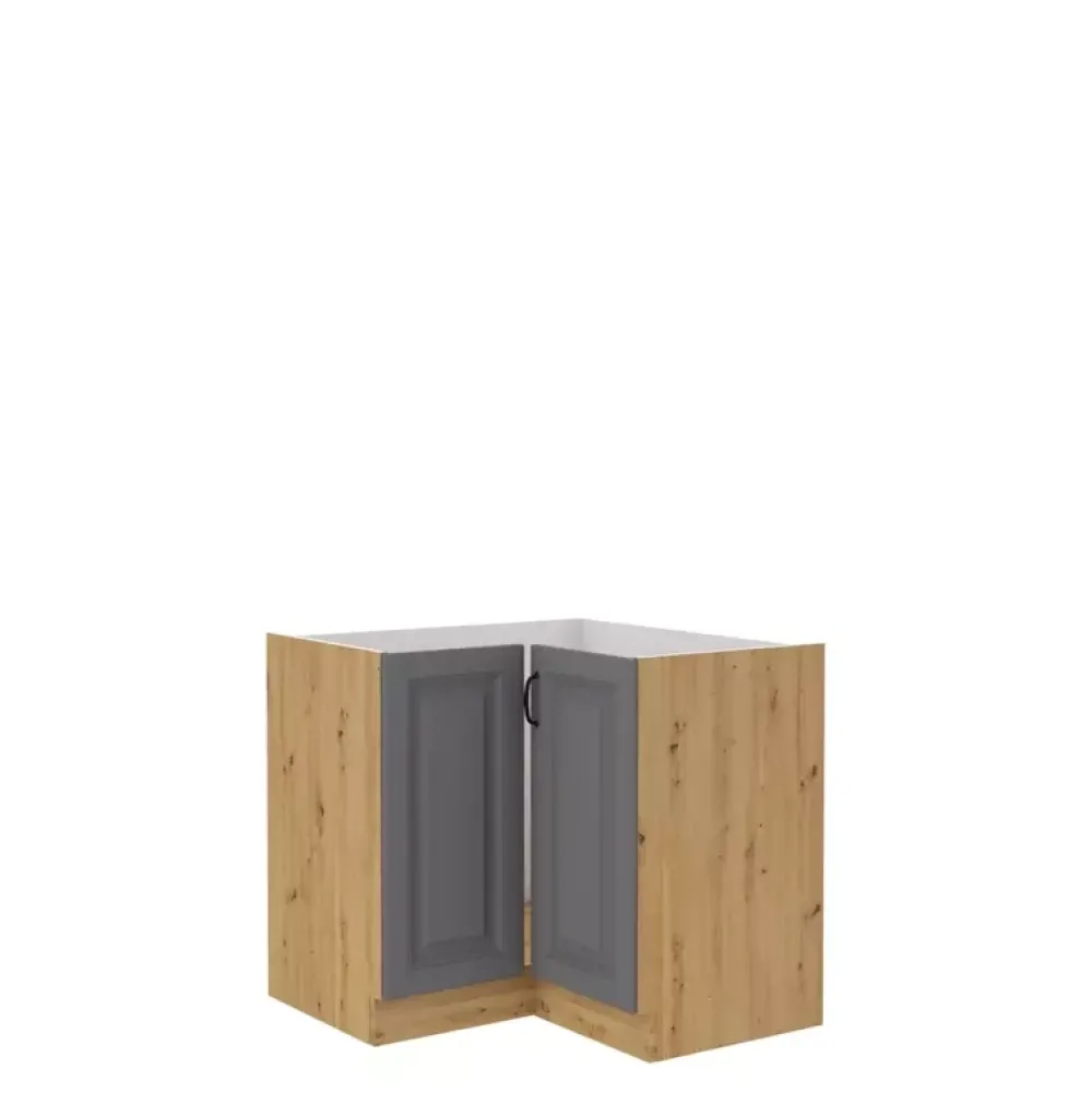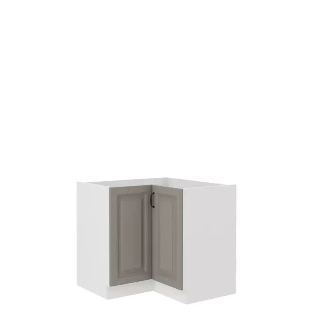 Stojąca szafka narożna będzie idealnym miejscem na garnki, czy inne kuchenne akcesoria. Szafka posiada jedną półkę, a jej front składa się z dwóch części, połączonych ze sobą na zawiasach. Pociągając za uchwyt, otwierasz obie części. Szafka posiada proste zawiasy, bez systemu cichego domykania. Szafka opiera się na cokole w kolorze korpusu.