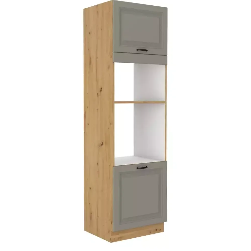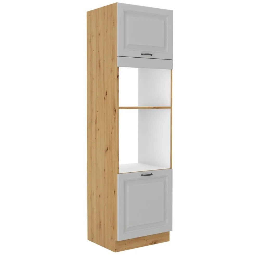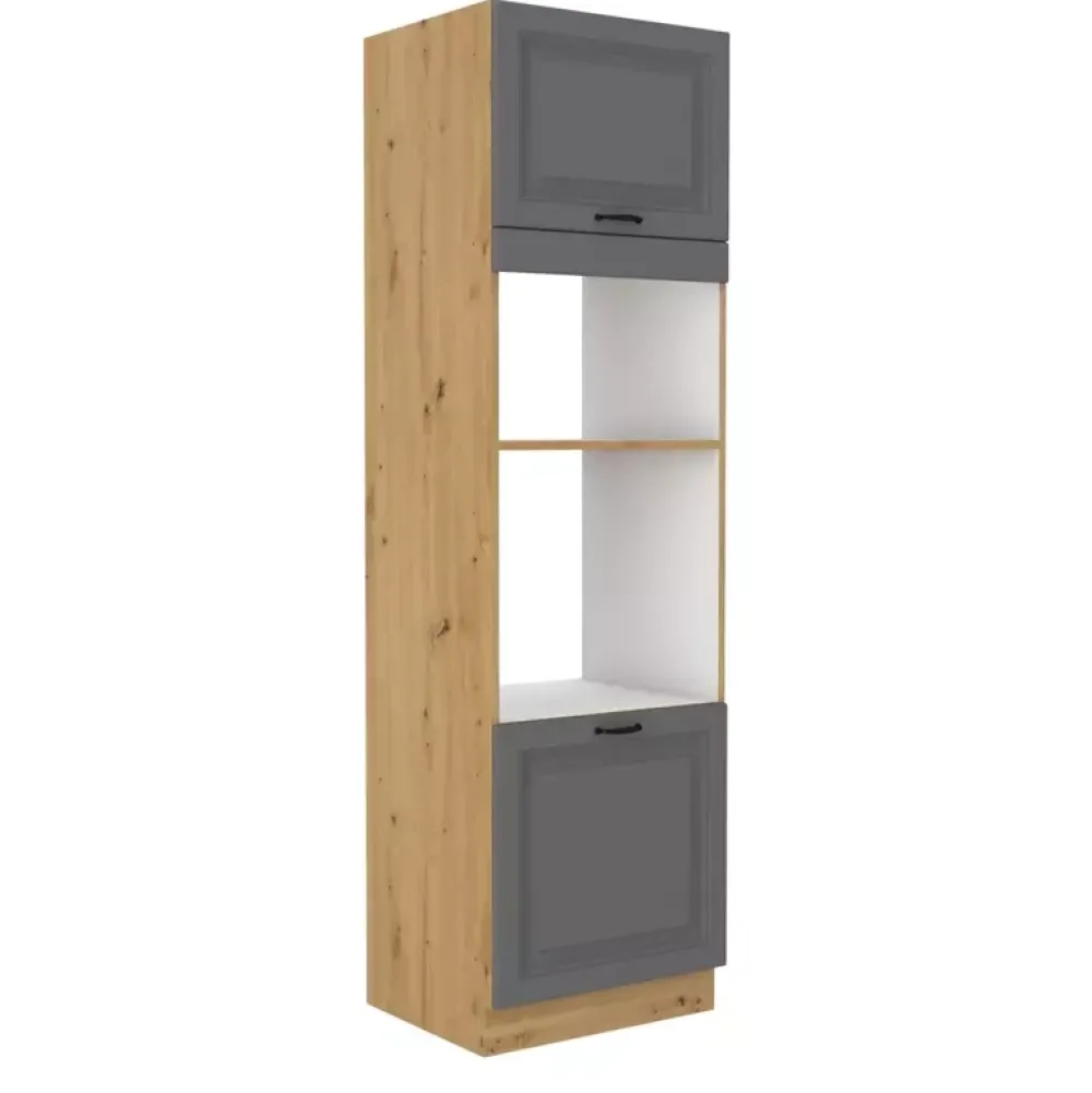 Wysoki słupek kuchenny ma 60 cm szerokości i jest przystosowany pod zabudowę piekarnika i mikrofali. Szafka idealnie sprawdzi się pod przechowywanie zapasów żywności, jak i drobnych akcesoriów kuchennych, ponieważ ma również półki ukryte za zamykanymi drzwiami. Zawiasy posiadają mechanizm cichego domykania, co gwarantuje delikatne zamykanie i otwieranie drzwi. Szafka opiera się na cokole w kolorze korpusu. Wybierz odpowiadający Ci kolor korpusu i frontów, klikając przycisk „Dopasuj i kup”.