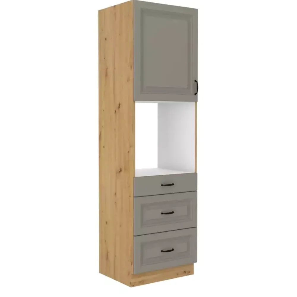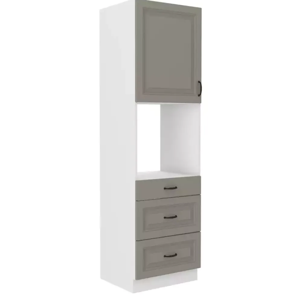 - Wysoka szafka pod zabudowę piekarnika ms 60 cm szerokości i została wyposażona w jedną półkę i trzy szuflady.
