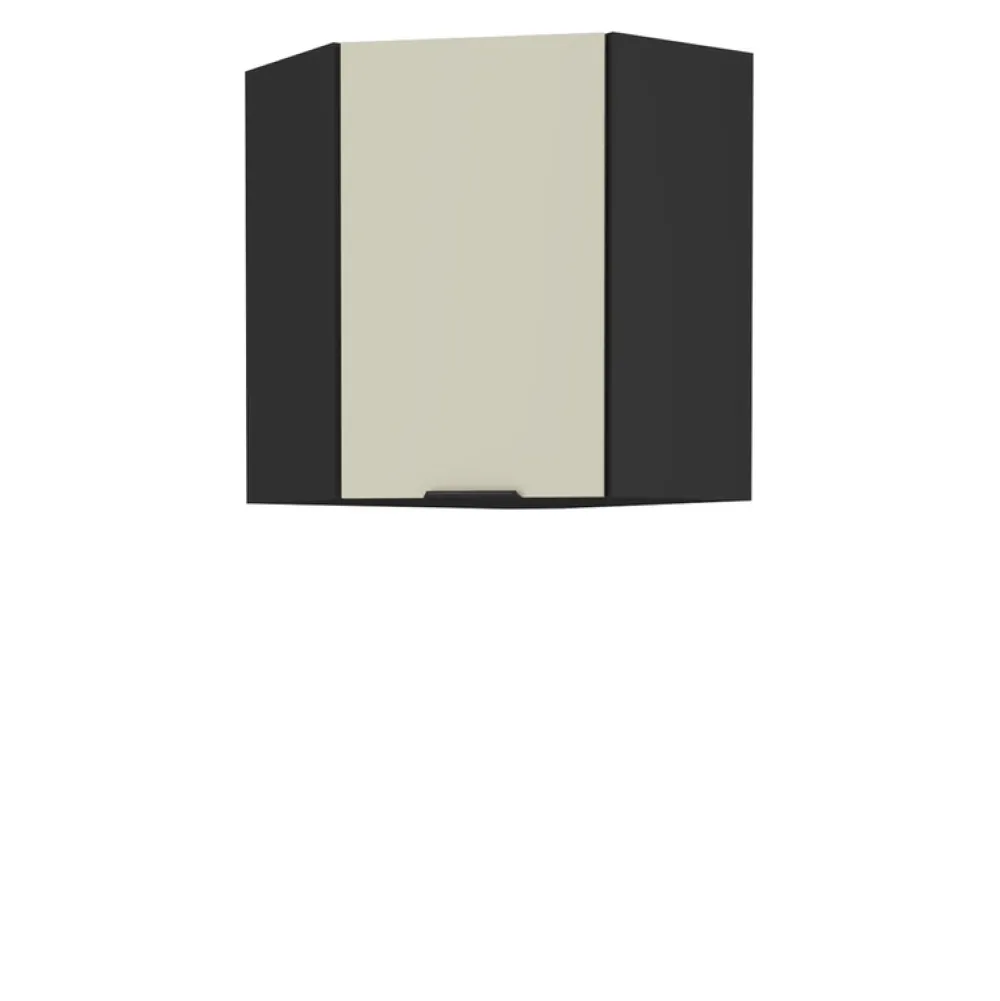 - Narożna szafka wisząca ANES zagwarantuje Ci łatwy dostęp do kuchennych akcesoriów, a także dopełni cała aranżacje. Front w kolorze kaszmiru. Uchwyt z aluminium w kolorze czarnym. Wykonana została z płyty laminowanej o grubości 16 mm.