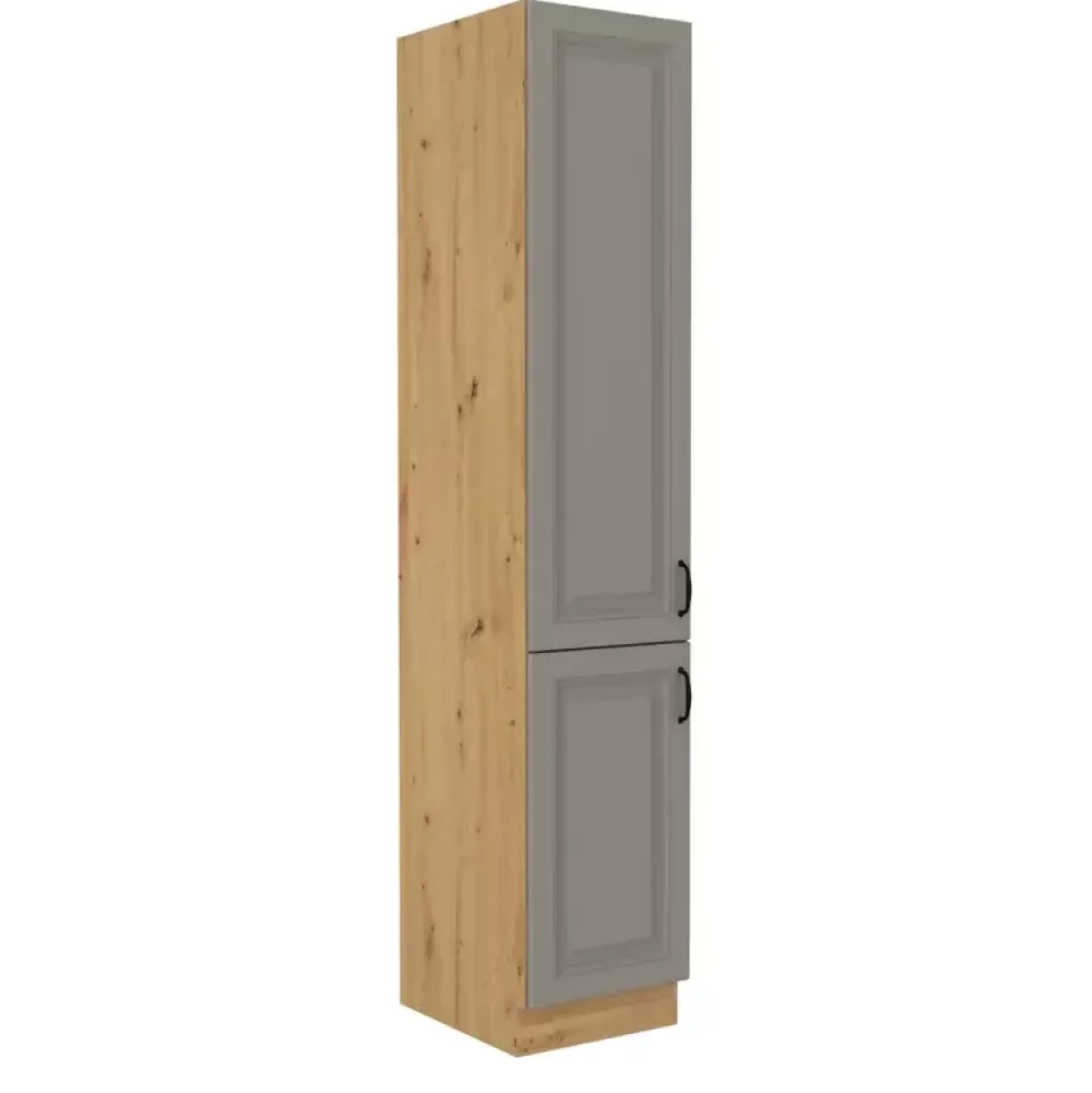 Wysoki słupek kuchenny ma 40 cm szerokości i wyposażono go w pięć półek, co daje sześć wnęk do przechowywania. Szafka idealnie sprawdzi się pod przechowywanie zapasów żywności, jak i drobnych akcesoriów kuchennych. Zawiasy posiadają mechanizm cichego domykania, co gwarantuje delikatne zamykanie i otwieranie drzwi. Szafka opiera się na cokole w kolorze korpusu. Wybierz odpowiadający Ci kolor korpusu i frontów, klikając przycisk „Dopasuj i kup”.