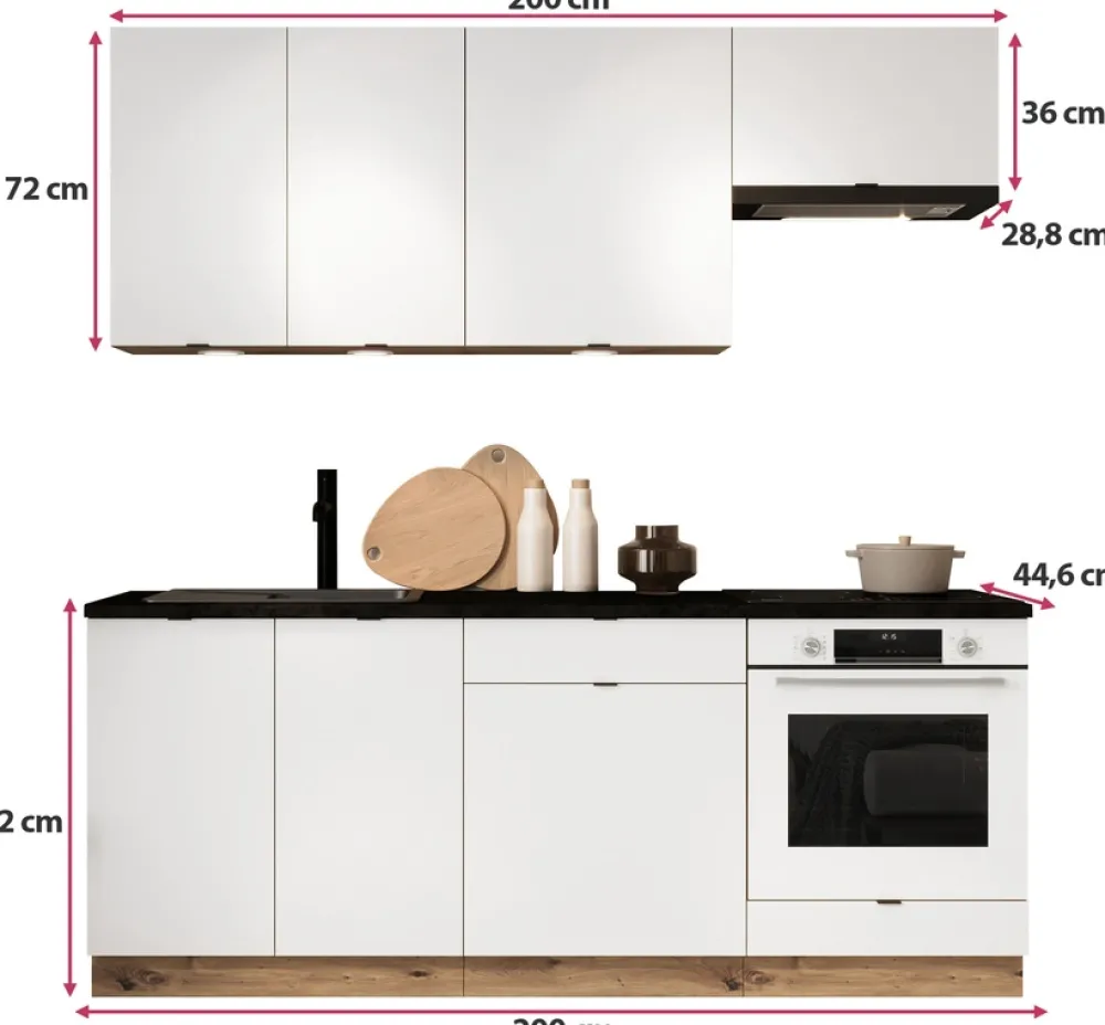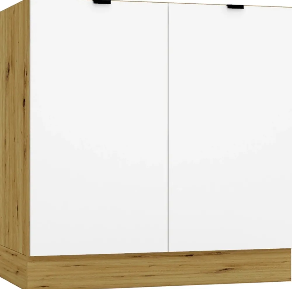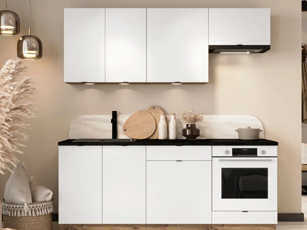 Cały zestaw wykończony jest stylowymi, czarnymi uchwytami, które dodają meblom eleganckiego, nowoczesnego charakteru. Wykonane z dbałością o detale, uchwyty podkreślają prostotę formy, doskonale wpisując się w trendy minimalistyczne. Zawiasy puszkowe zapewniają stabilność i wygodę codziennego użytkowania, a zestaw łączy w sobie estetykę i funkcjonalność, idealnie komponując się w każdej kuchni, od industrialnych po klasyczne wnętrza.