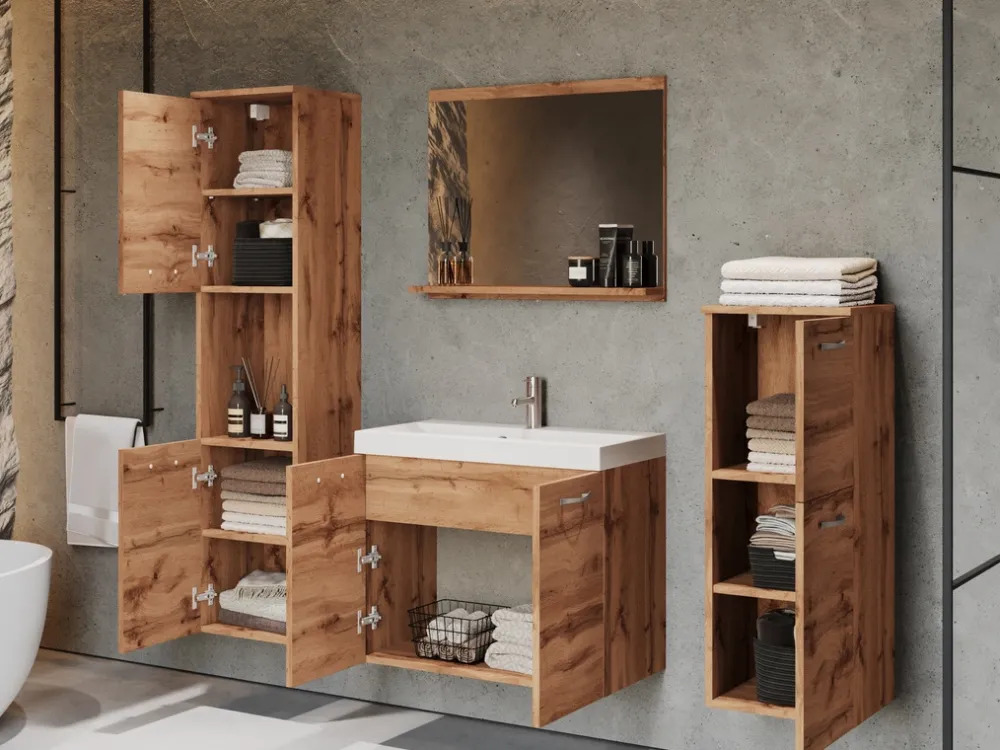 Wiszące szafki łazienkowe to propozycja do małej łazienki, w której potrzebujesz funkcjonalnych rozwiązań. W szafce pod umywalkę znajdzie się miejsce na zapasowe ręczniki, a słupki łazienkowe z dużą ilością półek zapewnią miejsce do przechowywania kosmetyków i środków czystości. Zastosowane w szafkach metalowe uchwyty to przede wszystkim wygoda i komfort dla użytkowników. Decydując się na zakup mebli łazienkowych MOLO zyskasz atrakcyjną przestrzeń do przechowywania niezbędnych akcesoriów kosmetycznych, artykułów higienicznych czy środków czystości.