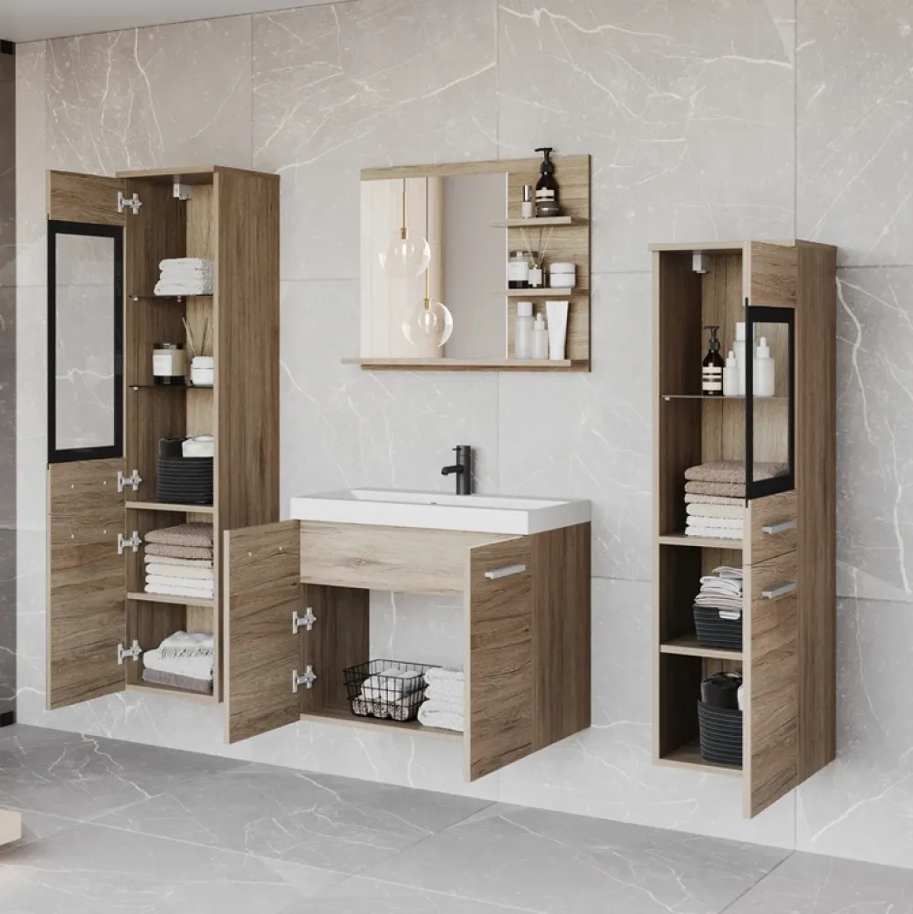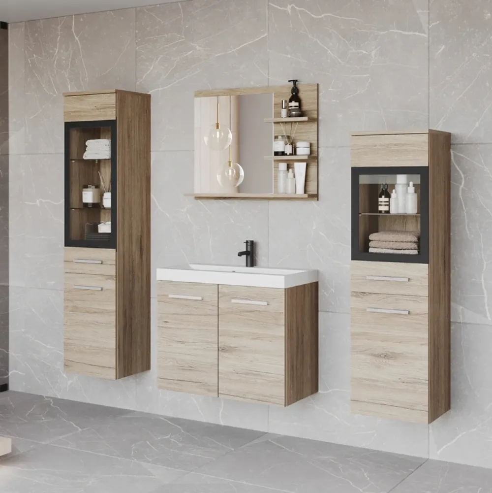 W zestawie z kolekcji USEDOM znajdują się dwie szafki wiszące wyposażone w dwie półki z płyty laminowanej i jedną szklaną. Takie szafki łazienkowe to świetne miejsce na kosmetyki, ręczniki, czy perfumy. W zestawie znajduje się również szafka pod umywalkę oraz umywalka. Wraz z witrynami i szafką pod umywalkę jest półka, która jest bardzo praktycznym elementem i potrzeba jej w każdej łazience.