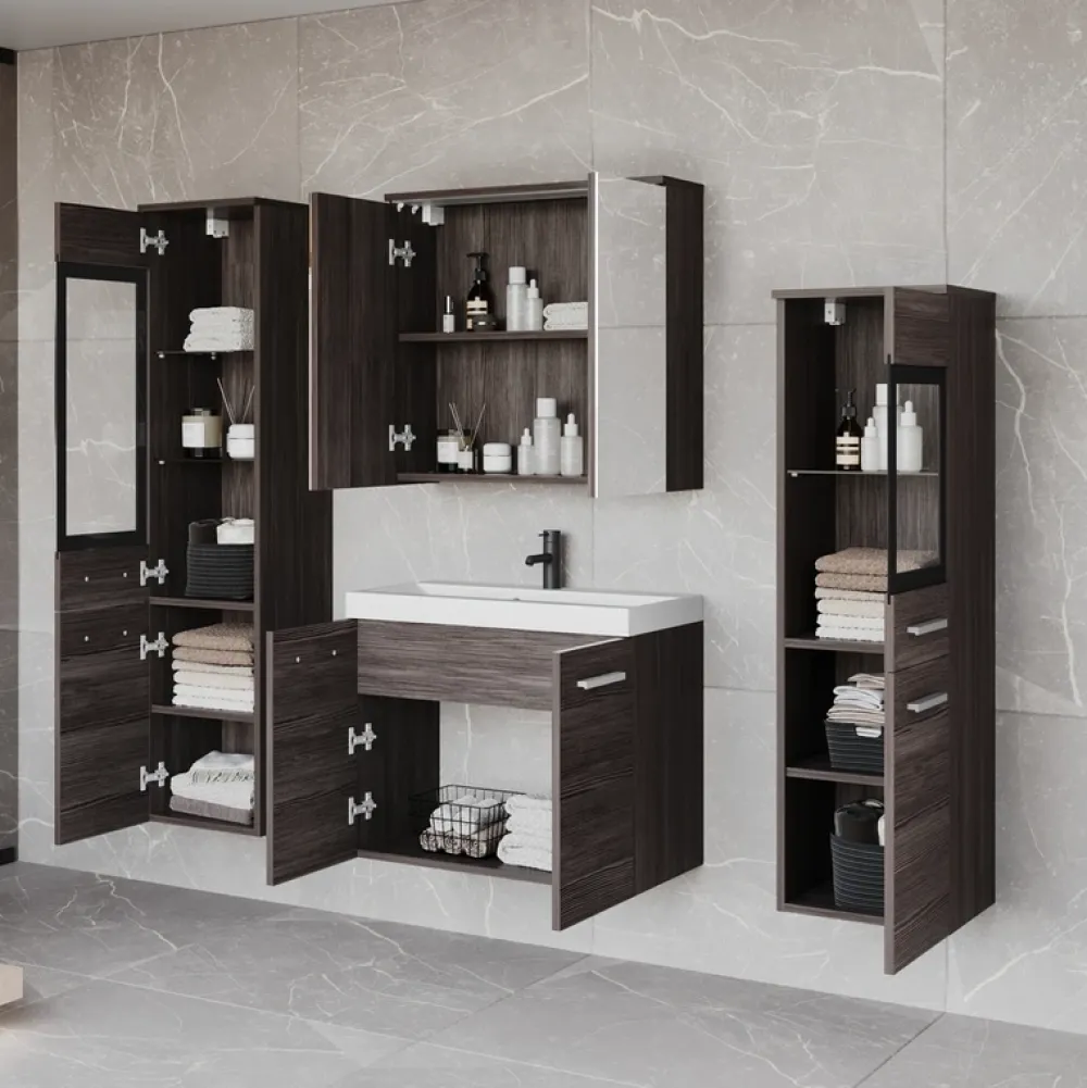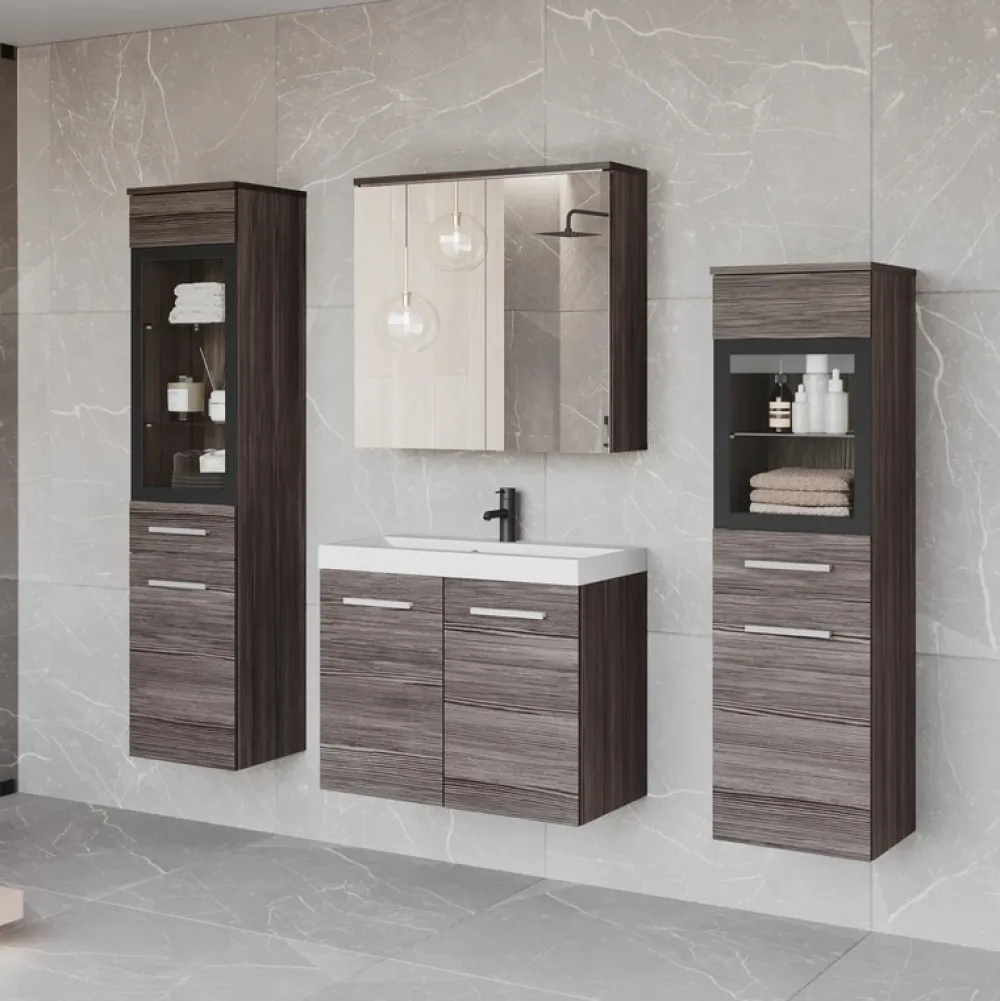 Dodatkowo zestaw zawiera szafkę z lustrem, która oferuje dwa poziomy do przechowywania. Szafka ta nie tylko dodaje przestrzeni do przechowywania, ale również optycznie powiększa wnętrze łazienki, wprowadzając do niej więcej światła.