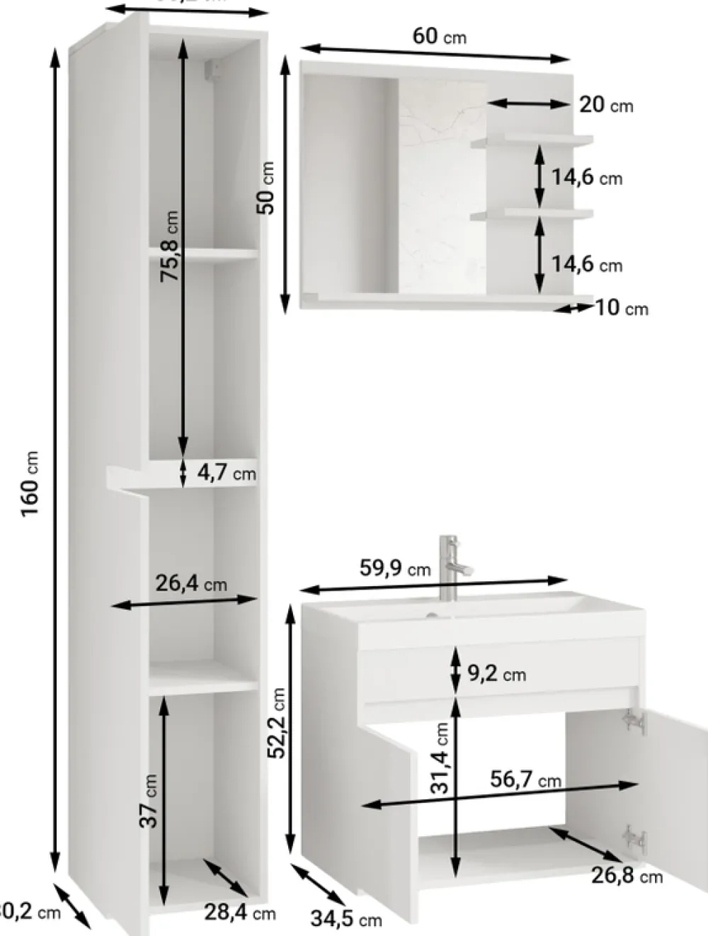 Cały zestaw, wykonany z dbałością o każdy detal, reprezentuje nowoczesność i wysoką jakość. Jego uniwersalny design sprawia, że będzie pasował do każdej łazienki, zarówno tej urządzonej w nowoczesnym, jak i bardziej klasycznym stylu. Zestaw wiszących mebli łazienkowych to inwestycja, która przemieni twoją łazienkę w przestrzeń relaksu i odnowy, zachwycając wyglądem i funkcjonalnością na lata.
