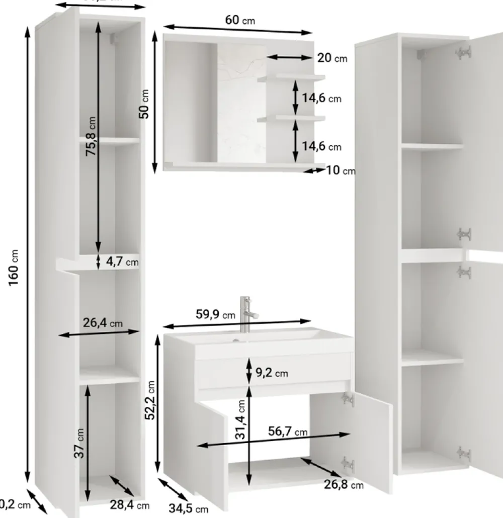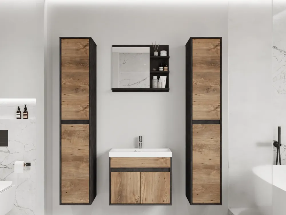Centralnym punktem zestawu jest szafka z umywalką o szerokości 60 cm, zaprojektowana z myślą o codziennej wygodzie. Umywalka, wykonana z najwyższej jakości materiałów, w połączeniu z przemyślaną szafką, stanowi idealne rozwiązanie zarówno pod względem estetyki, jak i funkcjonalności.