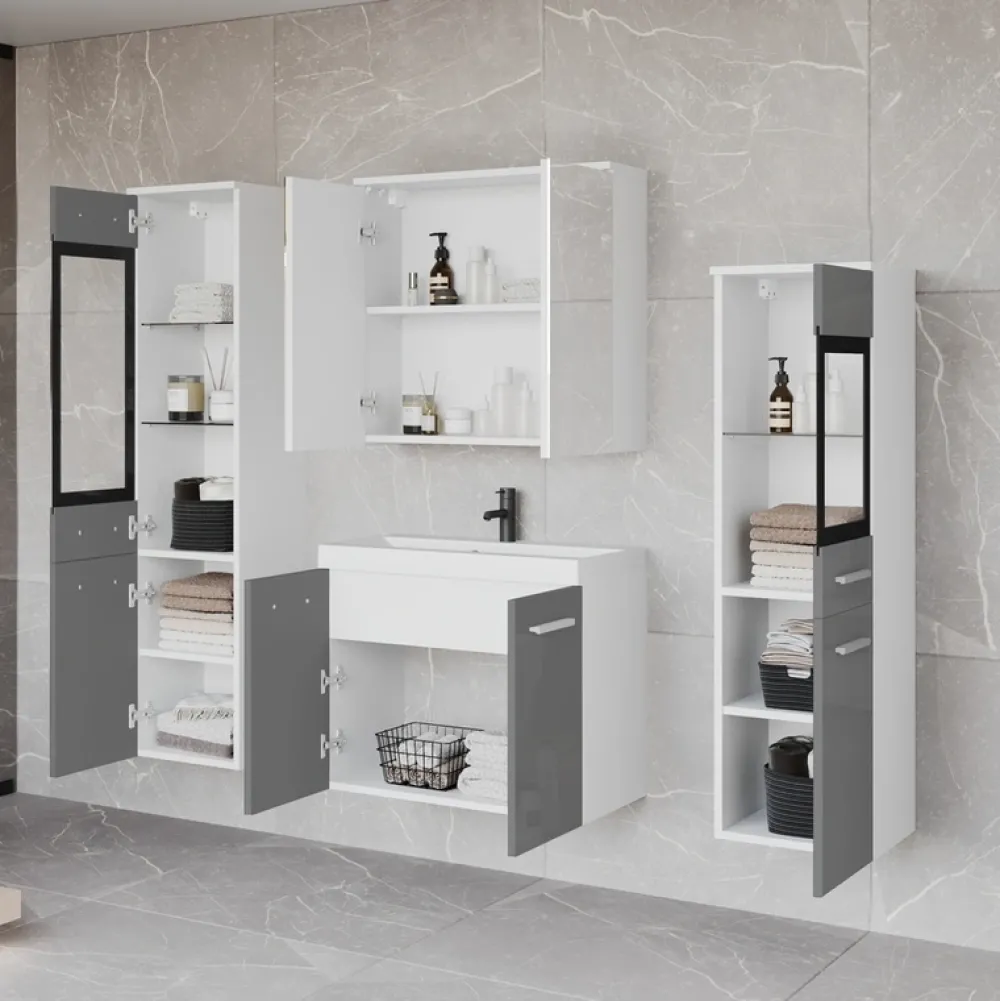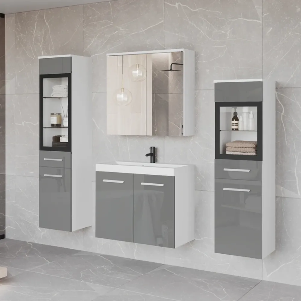 Dodatkowo zestaw zawiera szafkę z lustrem, która oferuje dwa poziomy do przechowywania. Szafka ta nie tylko dodaje przestrzeni do przechowywania, ale również optycznie powiększa wnętrze łazienki, wprowadzając do niej więcej światła.