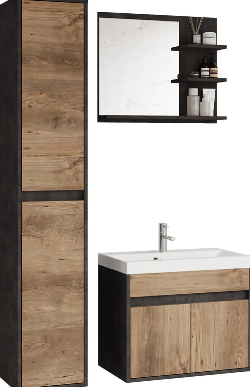 - Zestaw mebli łazienkowych CHAPO składa się ze słupka dwudrzwiowego z półkami, szafki z umywalką 60 cm oraz lustra z otwartymi półkami. Drzwi mebli otwierane są za pomocą pociągnięcia za krawędź. Obrzeża wykończono okleiną ABS. Okucia do montażu w zestawie