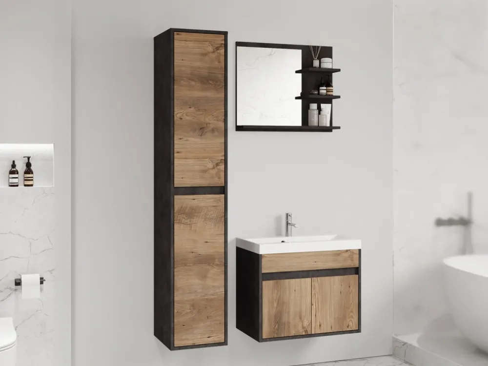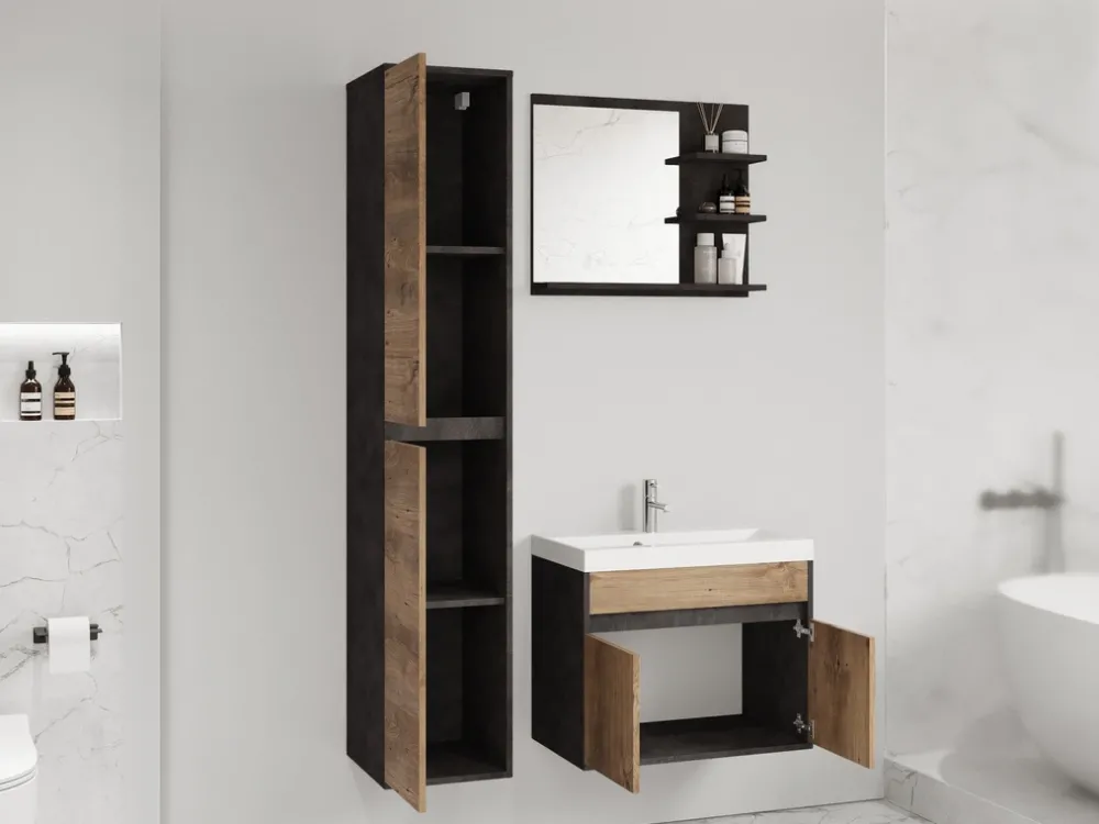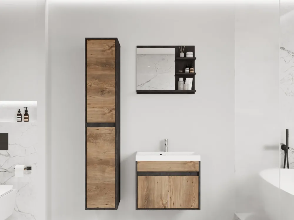 Serce zestawu stanowi stylowa szafka z umywalką o szerokości 60 cm, której płynne linie i bezuchwytowa konstrukcja podkreślają nowoczesną estetykę. Szafka, wykonana z wysokiej jakości 15 mm płyty laminowanej, zapewnia trwałość i łatwość w utrzymaniu, co czyni ją idealnym wyborem do codziennego użytku. Uzupełniona o ergonomiczną umywalkę, staje się nie tylko praktycznym, ale i wizualnym punktem centralnym łazienki.