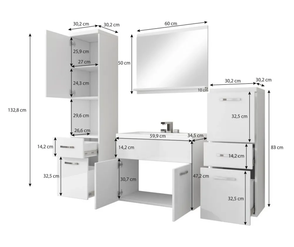 Komplet podwieszanych szafek łazienkowych to sposób na poprawę komfortu użytkowania (sprzątania) łazienki. W skład zestawu wchodzą: szafka z umywalką, dwa słupki łazienkowe oraz lustro z półką.