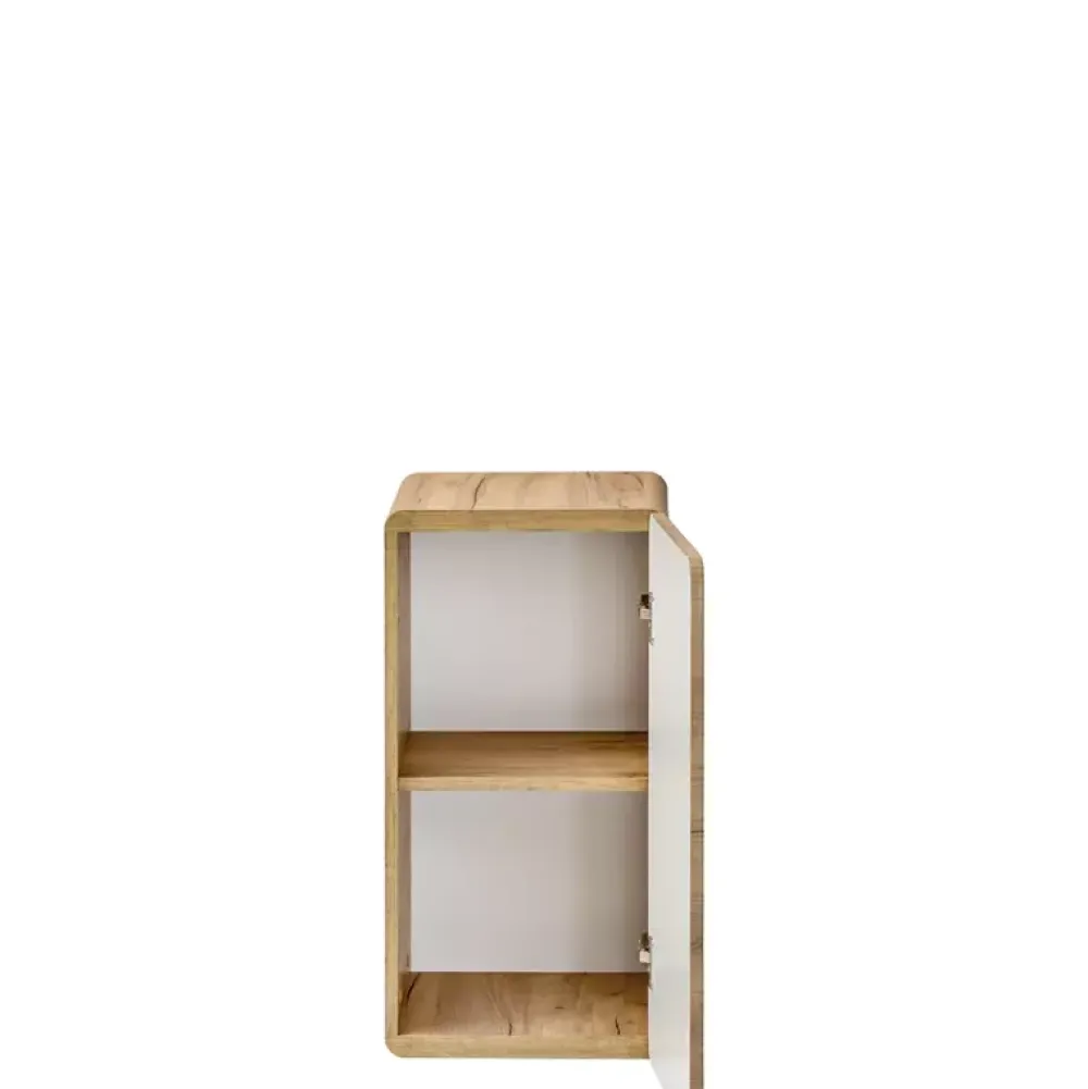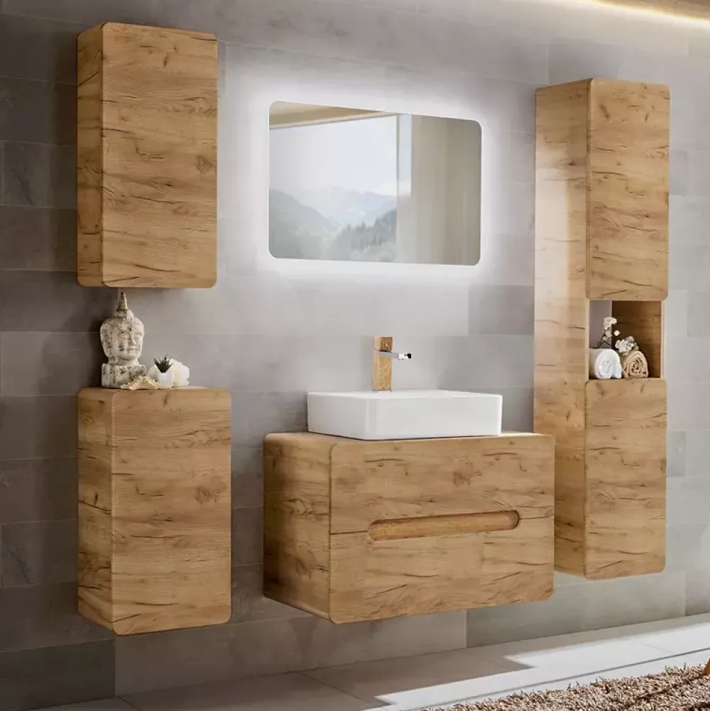 Zestaw mebli do łazienki AURELIO to propozycja składająca się z dwóch jednodrzwiowych szafek wiszących, za drzwiami każdej z nich znajduje się jedna półka, która doskonale sprawdzi się do umieszczenia drobnych akcesoriów łazienkowych. Wysoka szafka wisząca posiada drzwi u góry oraz u dołu, gdzie za każdymi z nich swoje miejsce znalazła półka, natomiast pomiędzy drzwiami znajduje się wnęka na drobne akcesoria łazienkowe. Nie zabrakło również szafki pod umywalkę posiadającą dwie pojemne szuflady. Uzupełnieniem zestawu pozostało lustro wiszące o wymiarze 80×60 cm. Drzwi szafek oraz ich szuflady zostały wzbogacone o bezgłośne mechanizmy z cichym domykiem.