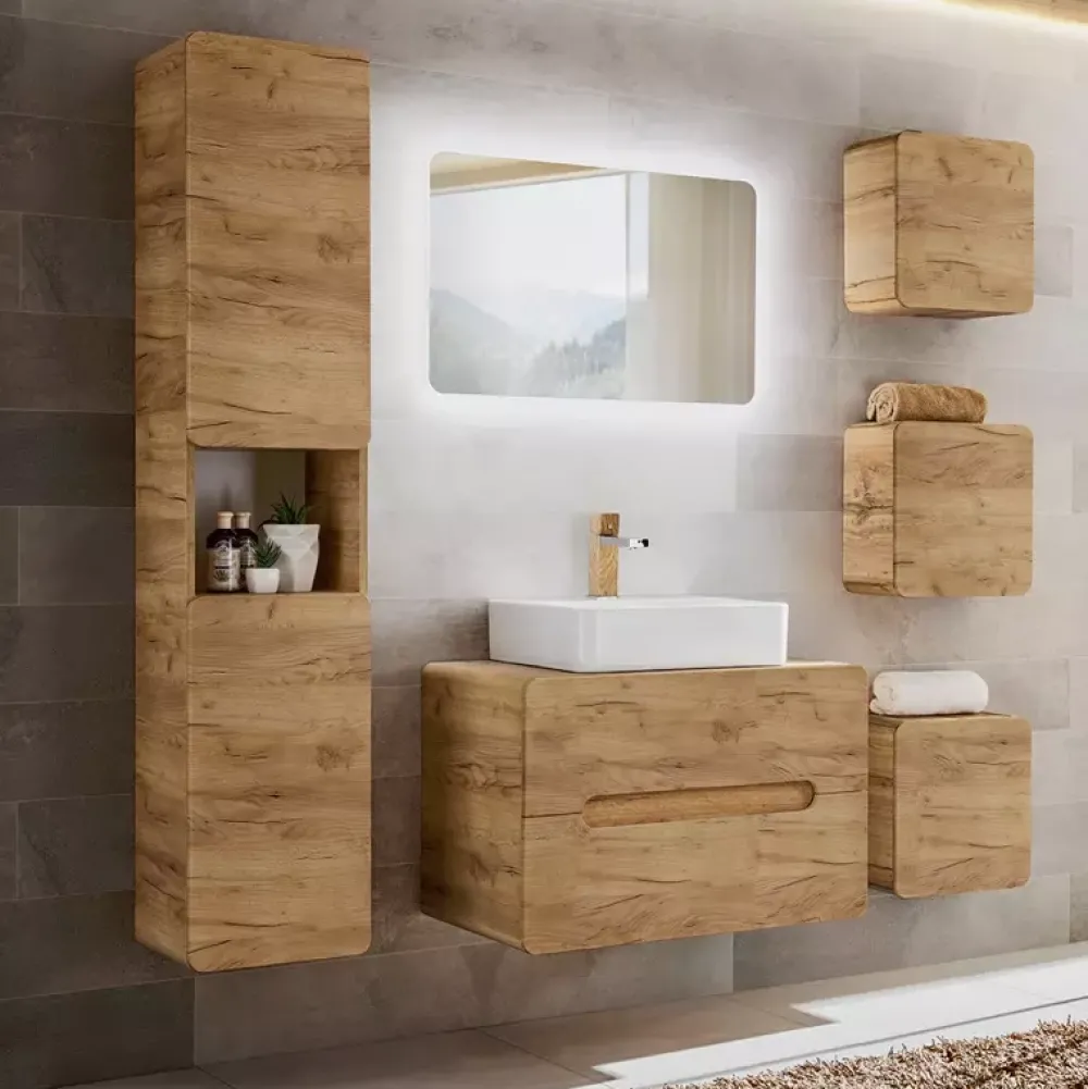 Zestaw mebli do łazienki AURELIO został wykonany w stonowanej oraz ponadczasowej stylistyce, dzięki której stanowi atrakcyjną propozycję na wyposażenie łazienki. W zestawie znajduje się wysoka szafka dwudrzwiowa, z wnęką pomiędzy drzwiami, gdzie za każdymi z nich znajduje się jedna półka. Szafka pod umywalkę nadblatową posiada dwie pojemne szuflady umieszczone na prowadnicach. Dodatkowo w zestawie swoje miejsce znalazły trzy szafki jednodrzwiowe, w których znajdziesz miejsce na swoje drobne akcesoria. Natomiast uzupełnieniem zestawu pozostało lustro wiszące o wymiarze 80×60 cm.