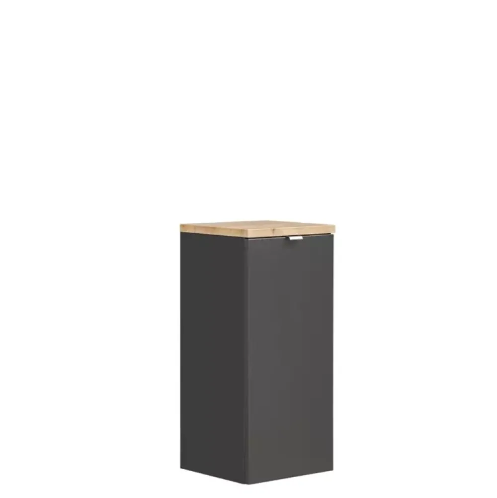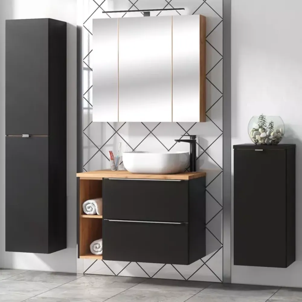 - Kompaktowy zestaw mebli łazienkowych składający się z wysokiego słupka, szafki wiszącej z lustrem, szafki z koszem na pranie, szafki pod umywalkę z małym słupkiem z otwartymi półkami oraz blatem, na którym znajduje się umywalka nablatowa.