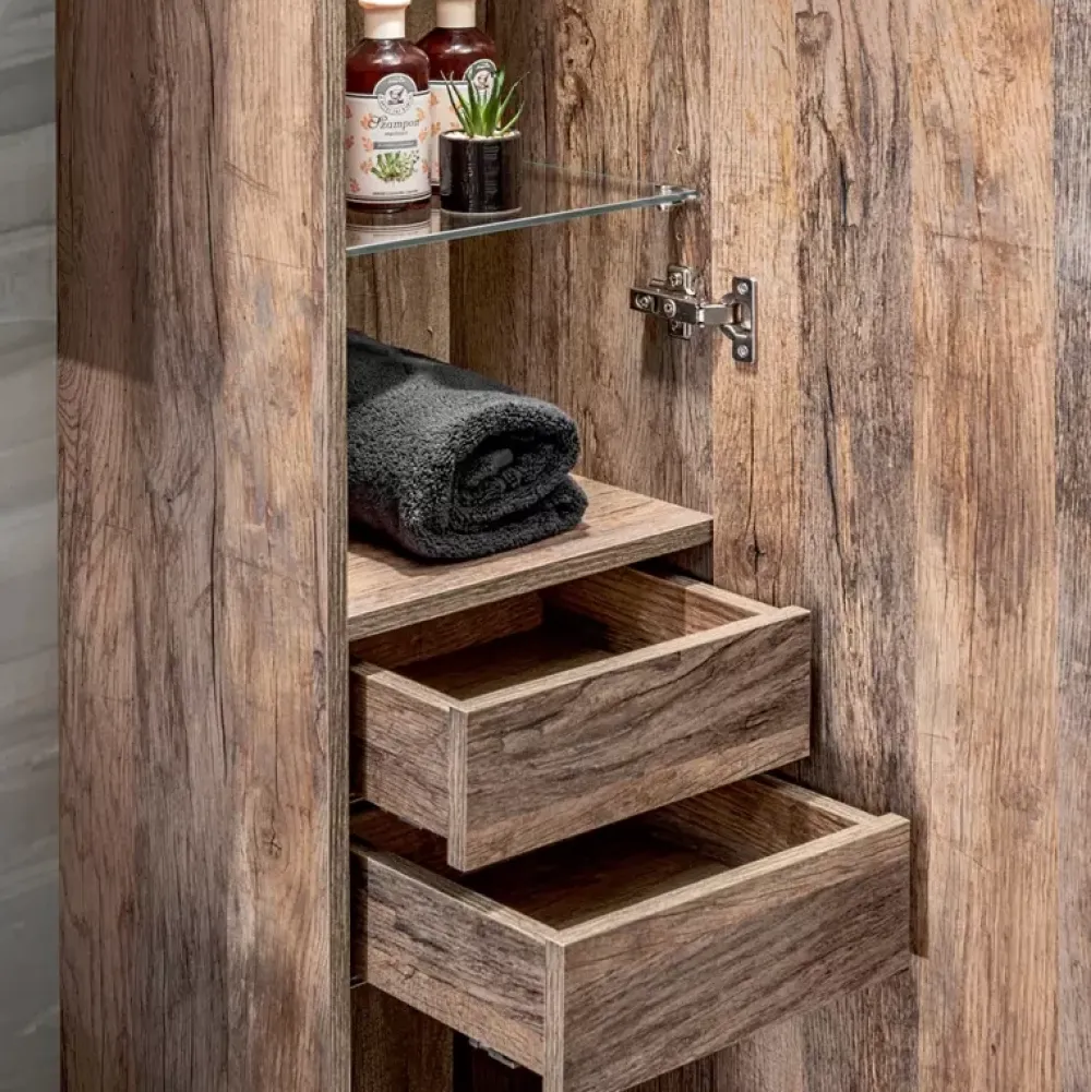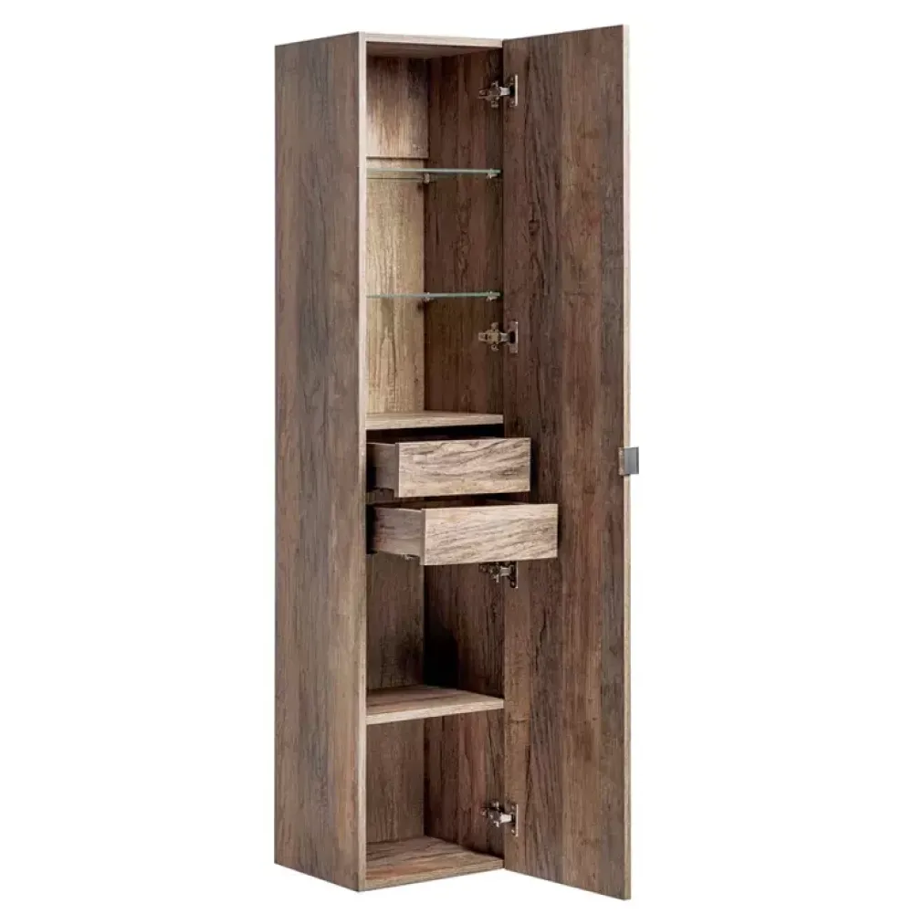 Słupek wiszący SANTELI wykonano w ponadczasowej stylistyce dzięki której w wyjątkowy sposób odnajduje swoje miejsce we współczesnych aranżacjach łazienkowych. Słupek został wyposażony w drzwi umieszczone na zawiasach wzbogaconych cichym domykiem, za którymi znajdują się liczne poziomy, które doskonale sprawdzą się do umieszczenia akcesoriów bądź tekstyliów w postaci ręczników. Dodatkowo w szafce swoje miejsce znalazły dwie szuflady osadzone na prowadnicach kulkowych.