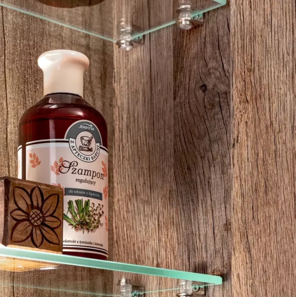 - Półki we wnętrzu wykonano z płyty laminowanej odpornej na wilgoć oraz szkła.