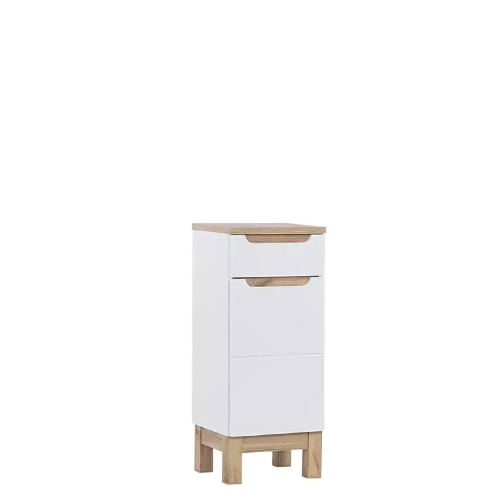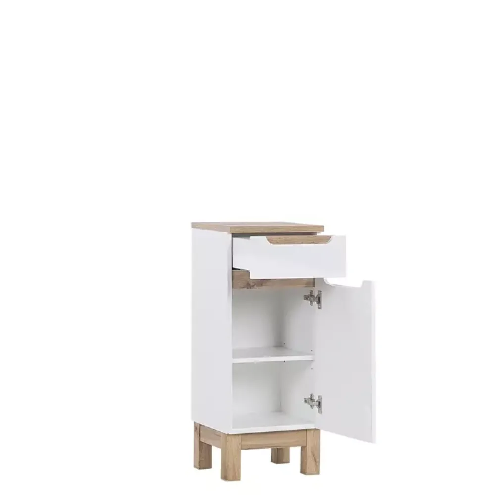 - Niska, stojąca szafka łazienkowa o szerokości 35 cm wyposażona w szufladę oraz półkę schowaną za drzwiczkami.