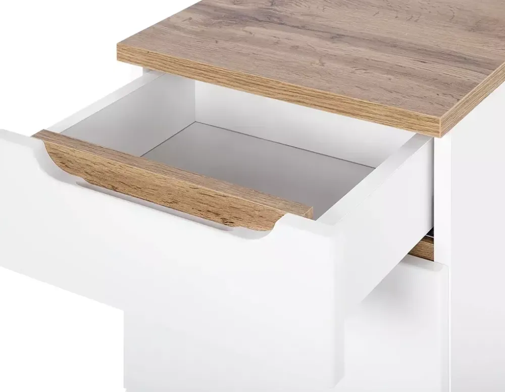 - Fronty wykonane z płyty MDF powlekane PCV wykończonej na wysoki połysk w kolorze Biały Kasai.