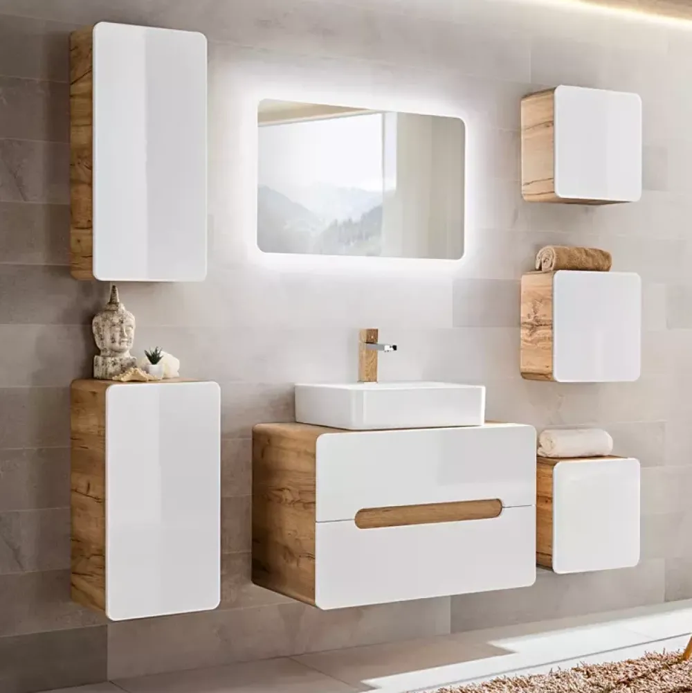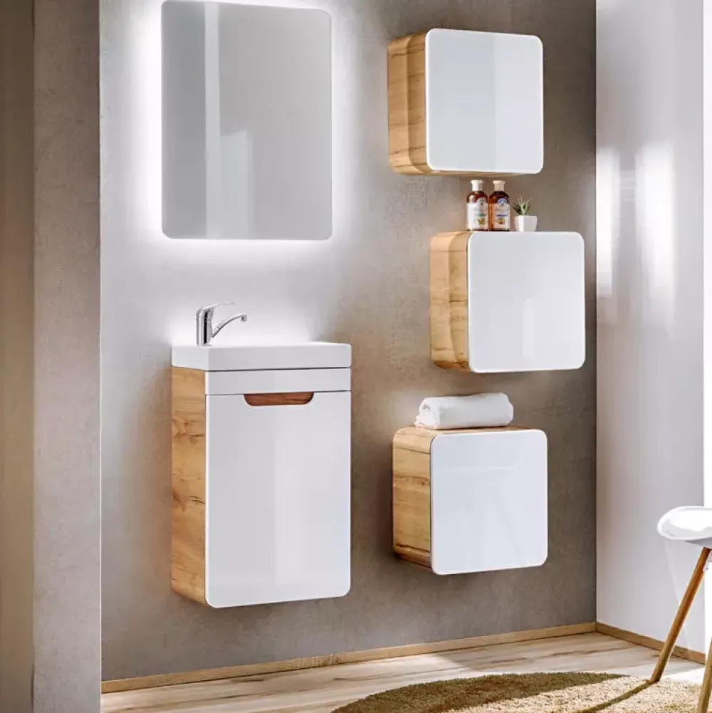 Wisząca szafka łazienkowa AURELIO została wykonana w nowoczesnej stylistyce, dzięki której stanowi ponadczasowe rozwiązanie. Szafka posiada drzwi umieszczone na zawiasach wzbogaconych o bezgłośny mechanizm cichego domyku, za którymi znajduje się przestrzeń przeznaczona do umieszczenia drobnych akcesoriów łazienkowych.