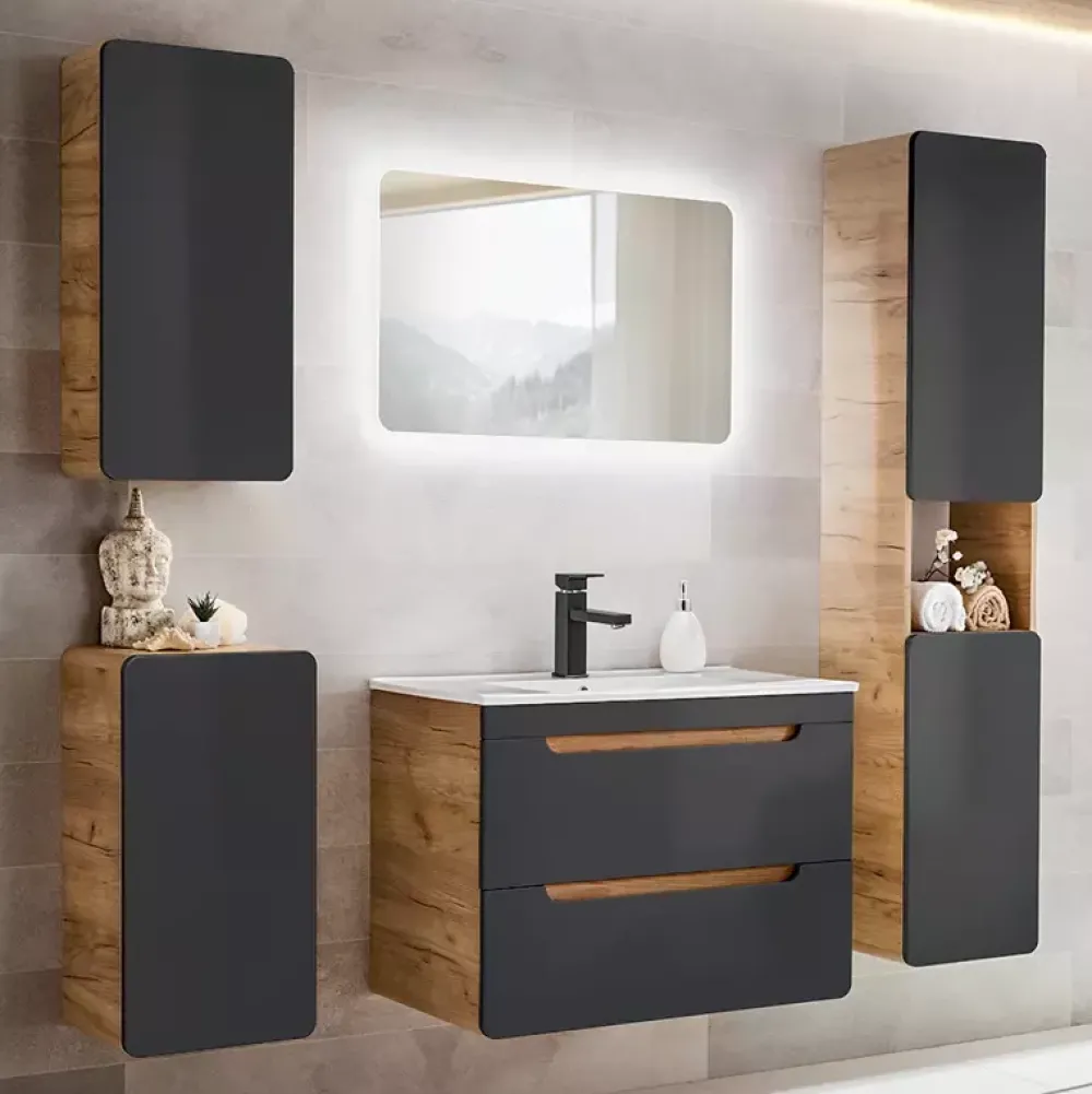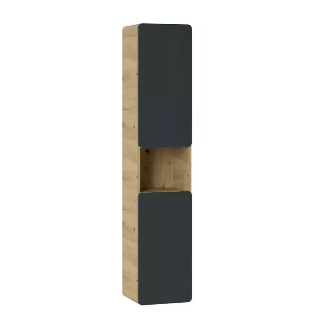 Wisząca szafka łazienkowa AURELIO jest propozycją, która dzięki wykonaniu w nowoczesnej stylistyce doskonale sprawdza się we współczesnych aranżacjach łazienkowych, tworząc ponadczasowe rozwiązanie. Szafka posiada drzwi u góry oraz na dole osadzone na zawiasach wzbogaconych bezgłośnym mechanizmem cichego domykania. Za drzwiami znajdują się dwa poziomy na ręczniki oraz rozmaite akcesoria łazienkowe. Dodatkowo do dyspozycji w szafce pozostaje wnęka na dekory oraz drobne akcesoria umieszczona w jej centralnej części.