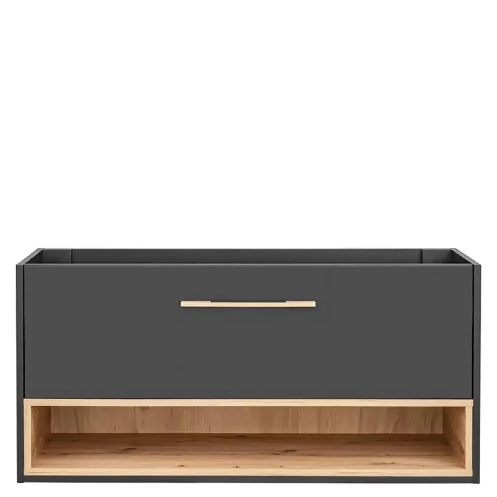 - Szeroka szafka wisząca o szerokości 120 cm do zabudowy umywalki wpuszczanej wyposażona w pojemną szufladą oraz otwartą półkę.