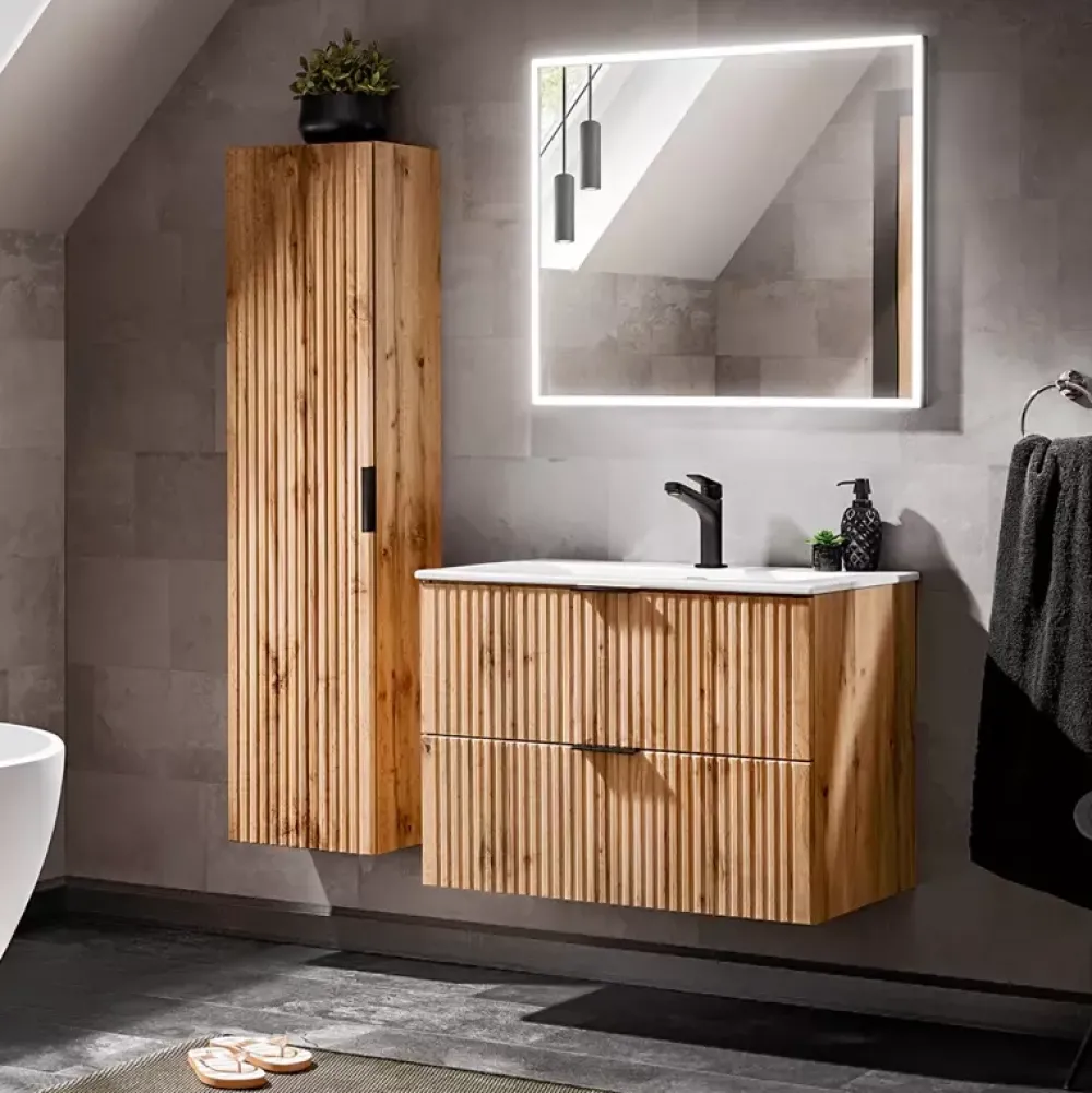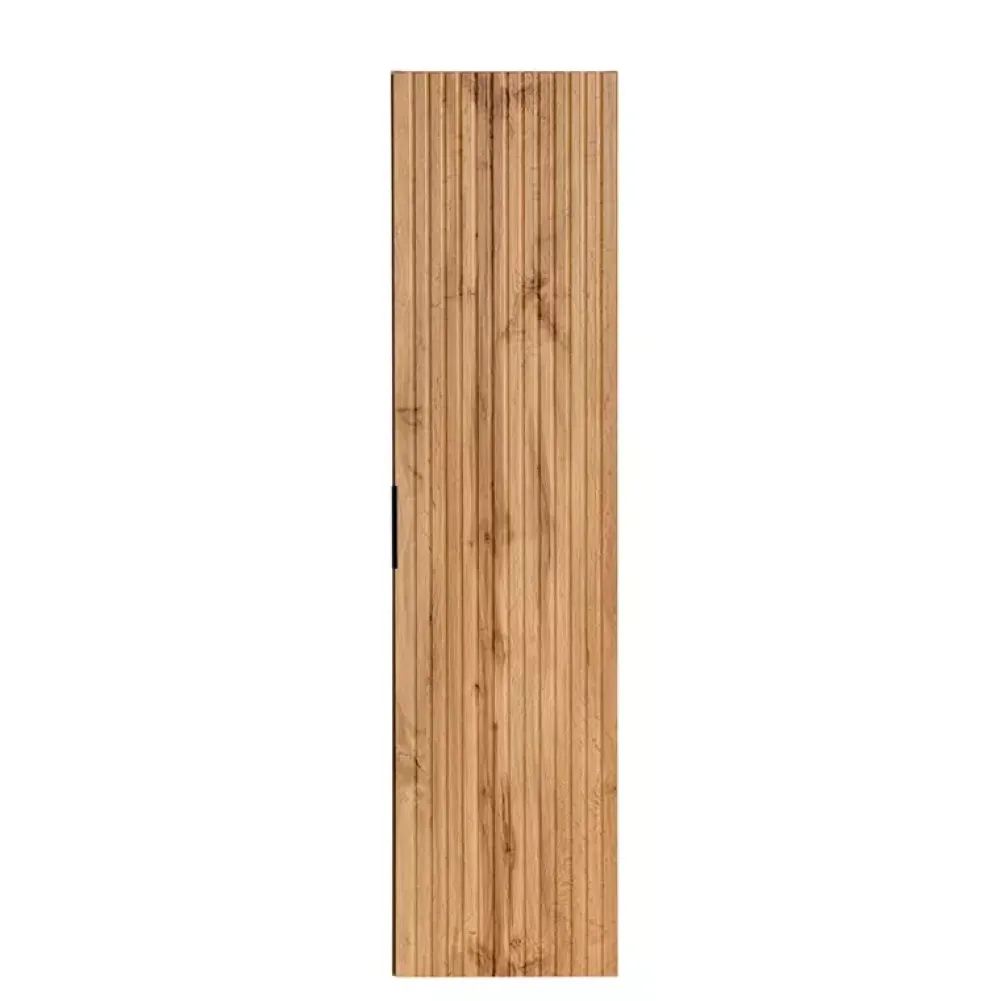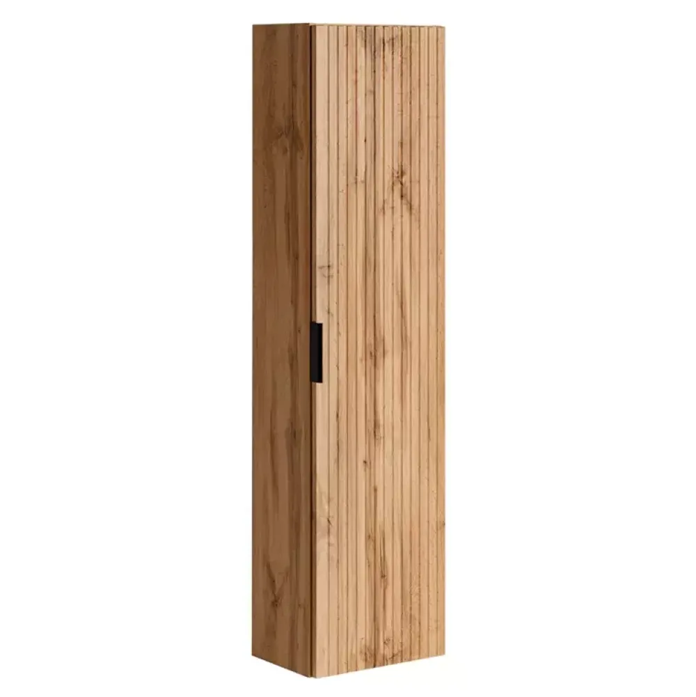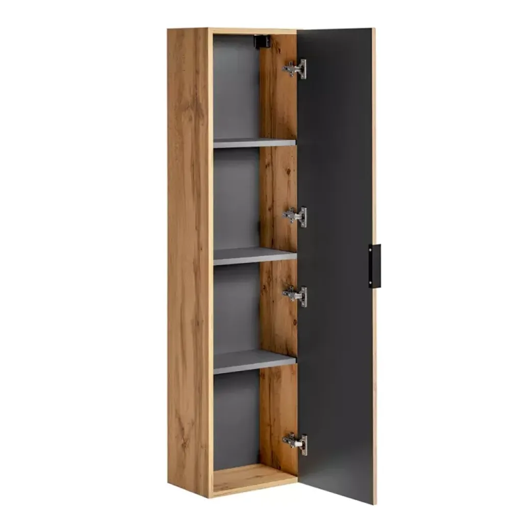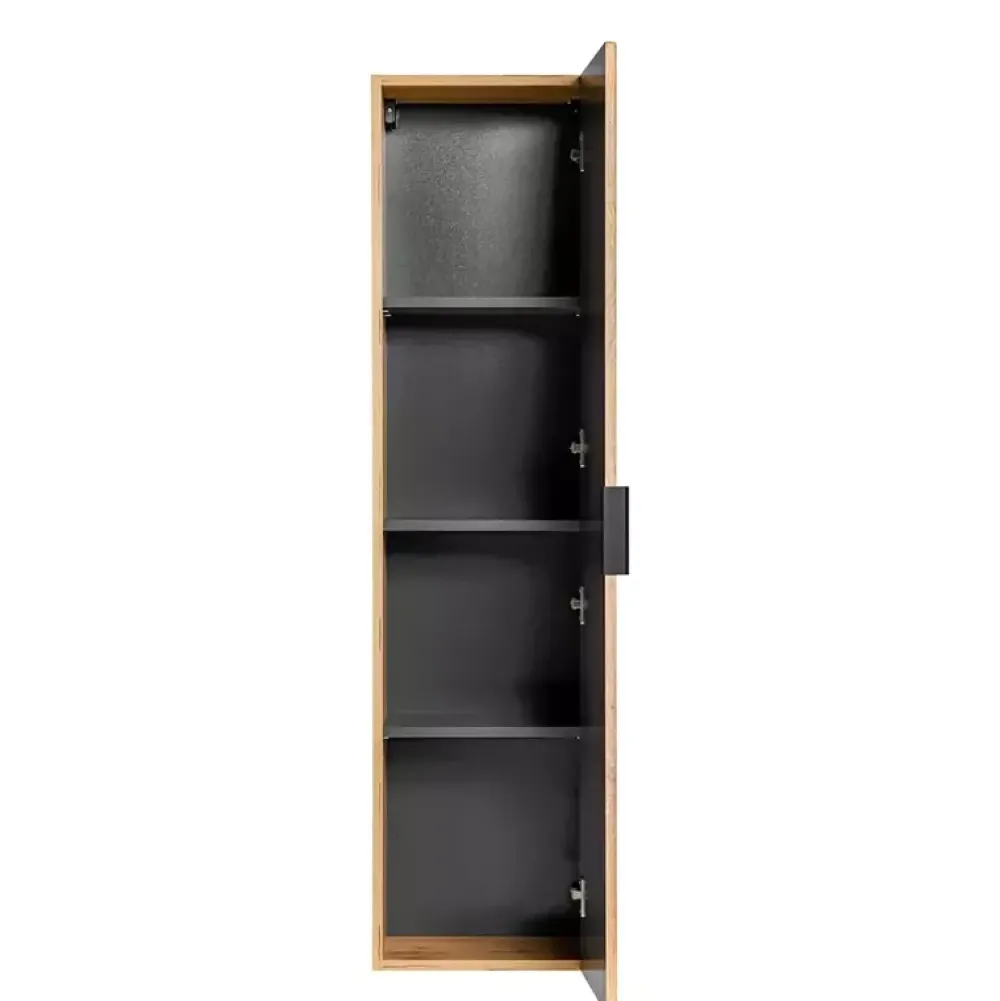 Szafka wisząca ADENILO o szerokości 60 cm została wyposażona w drzwi z frezowanym frontem osadzone na zawiasach wzbogaconych bezgłośnym mechanizmem cichego domyku. Za drzwiami szafki znajdują się trzy półki wykonane z płyty laminowanej o grubości 16 mm, które doskonale sprawdzą się do umieszczenia tekstyliów w postaci ręczników oraz akcesoriów. Dodatkowo szafka posiada uchwyt wykonane z tworzywa sztucznego w czarnym kolorze.