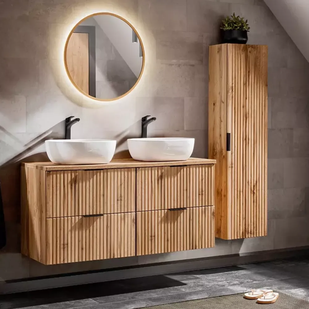 - Korpus oraz półki wykonano z płyty laminowanej, natomiast frezowany front wykonano z odpornej na wilgoć płyty MDF o grubości 16 mm.
