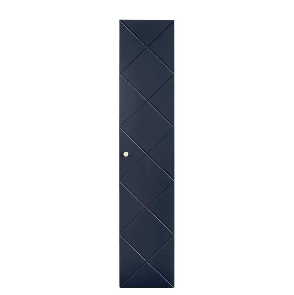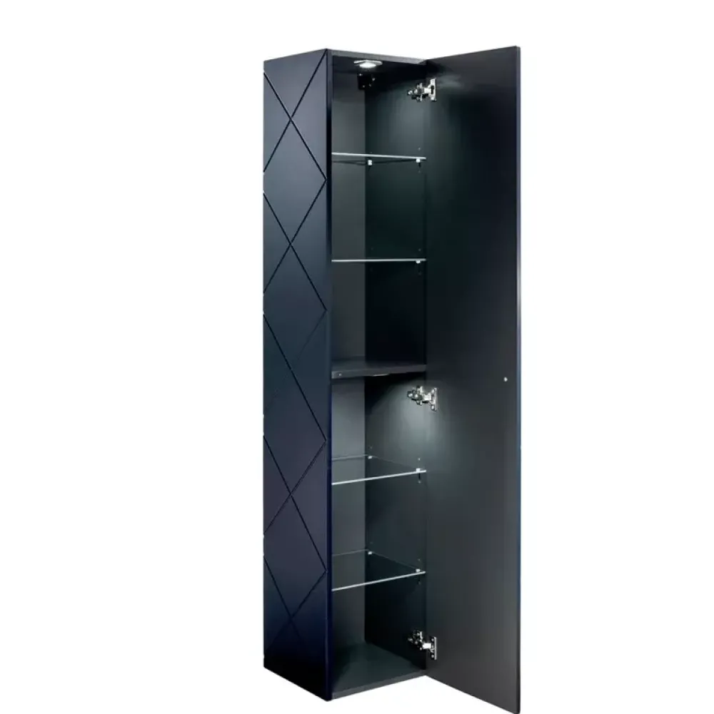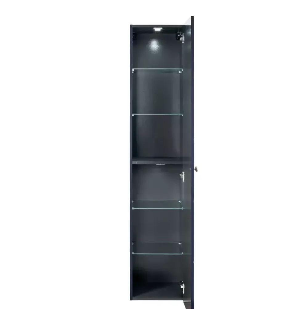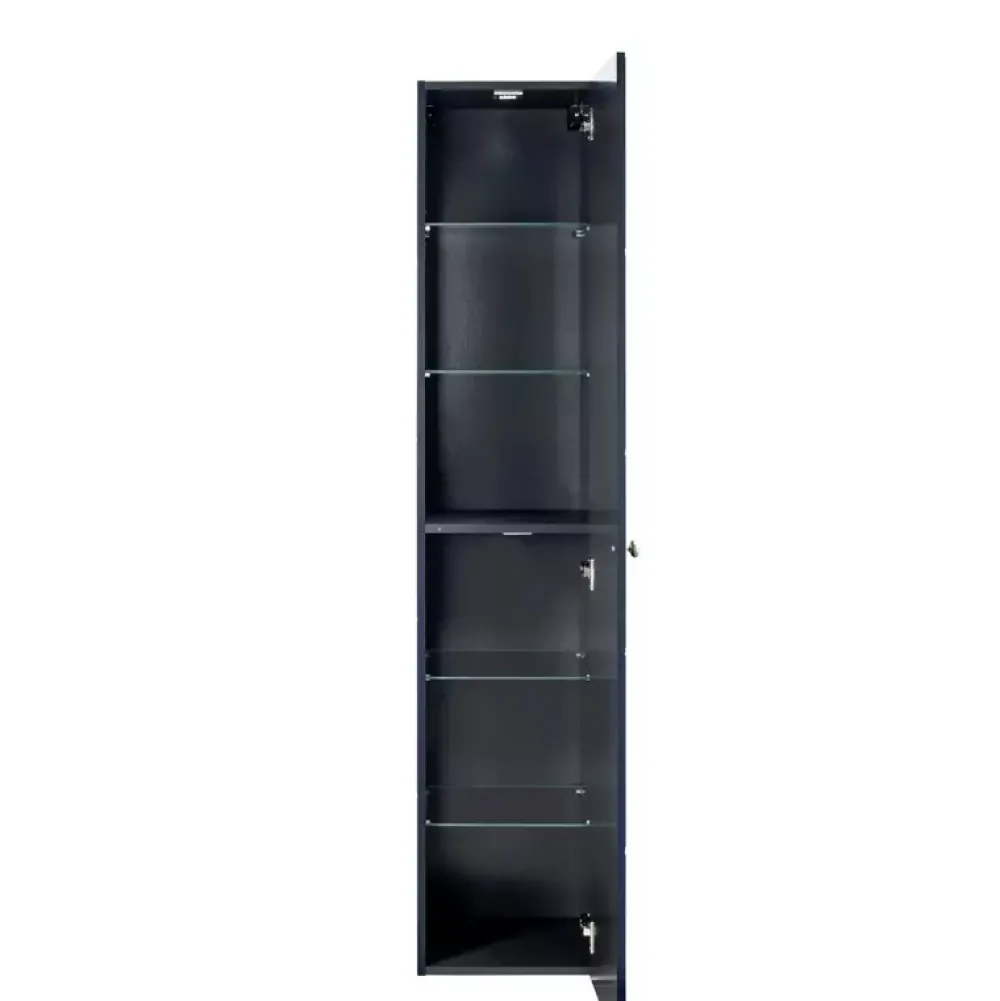 Szafka wisząca ELANISE została wykonana w wyjątkowej oraz ponadczasowej stylistyce, która poprzez frezowany front oraz korpus doskonale odnajduje się w nowoczesnych aranżacjach łazienkowych. Posiada drzwi osadzone na zawiasach wzbogaconych bezgłośnym mechanizmem cichego domyku, za którymi znajduje się pięć półek, z czego cztery wykonane ze szkła hartowanego. Dodatkowo uchwyt szafki został wykonany z aluminium ze złotym wykończeniem.
