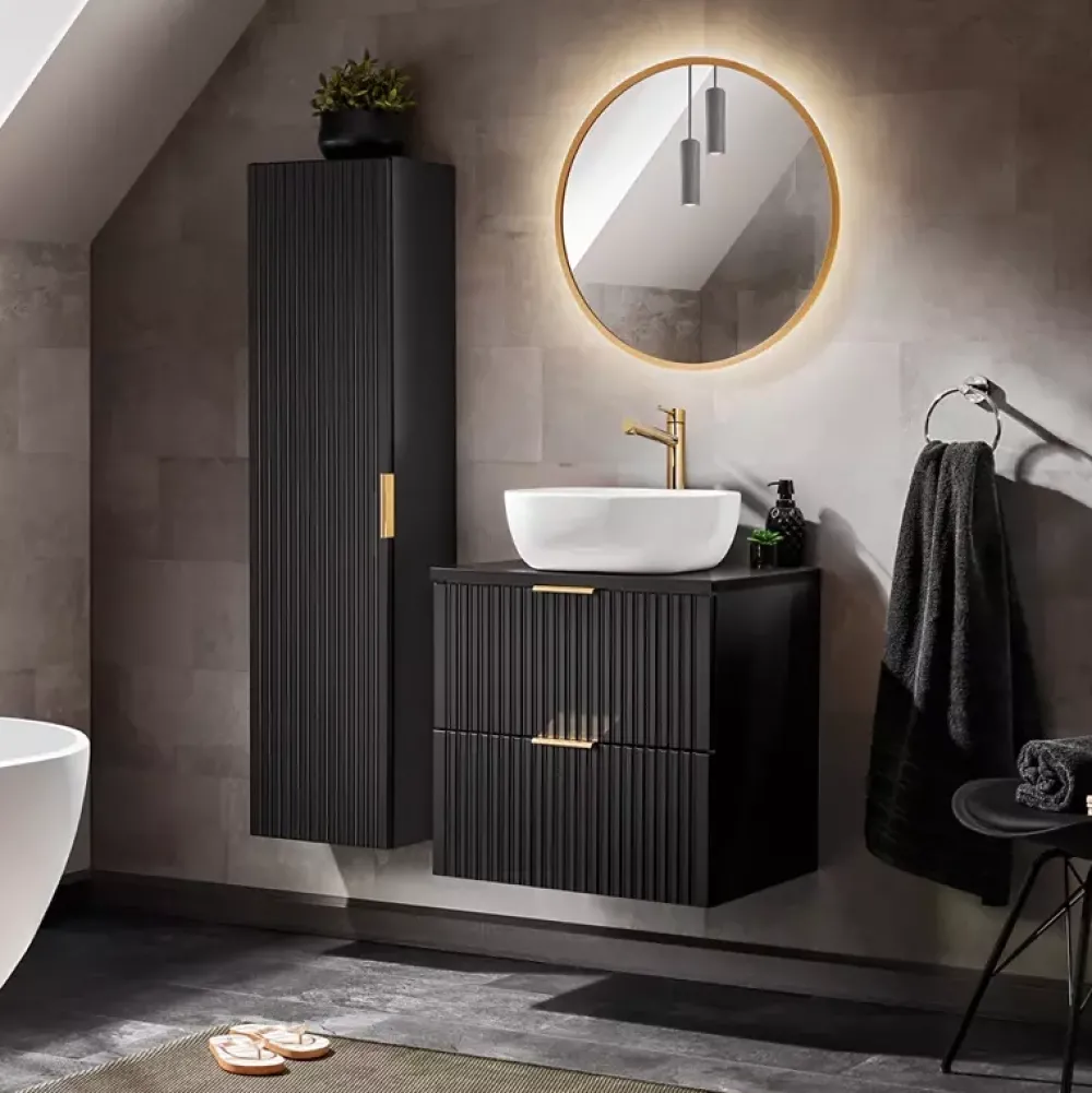 - Korpus oraz półki wykonano z płyty laminowanej, natomiast frezowany front wykonano z odpornej na wilgoć płyty MDF o grubości 16 mm.