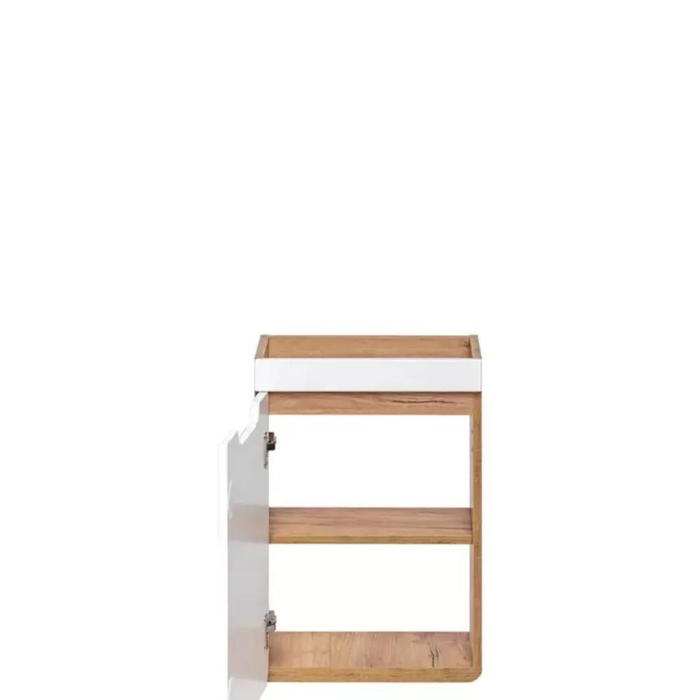 Wisząca szafka łazienkowa pod umywalkę AURELIO posiada 40 cm szerokości oraz przeznaczona jest do umieszczenia umywalki wpuszczanej. Szafka posiada drzwi umieszczone na zawiasach wzbogaconych o system cichego domyku, za którymi znajduje się półka, pod którą możesz umieścić rozmaite akcesoria. Dodatkowo front szafki wykonano w połysku.