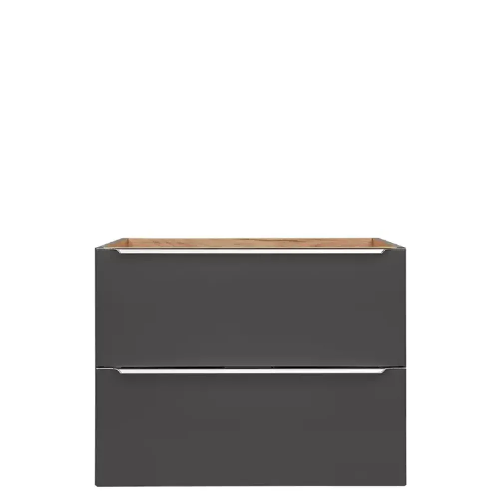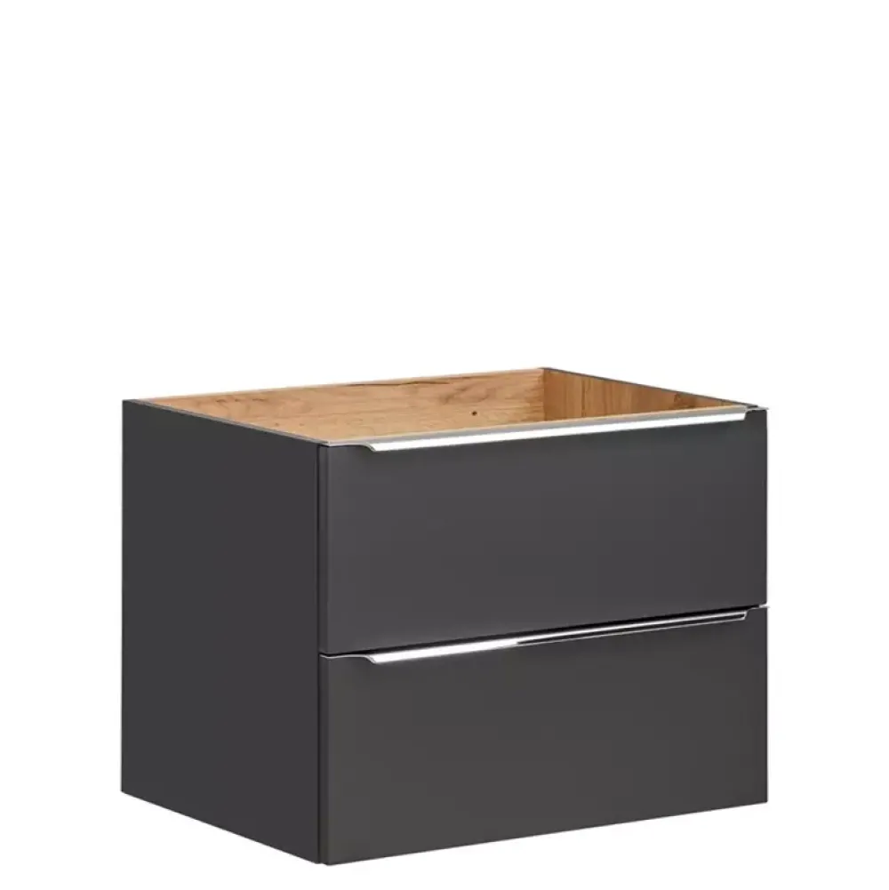- Szeroka szafka pod umywalkę o szerokości 80 cm wyposażona w dwie pojemne szuflady umocowane na prowadnicach z mechanizmem cichego domykania.