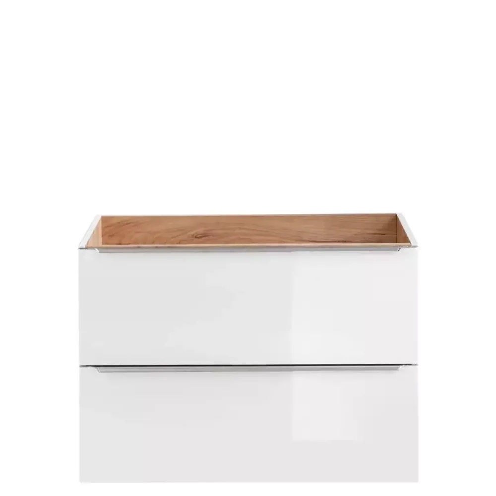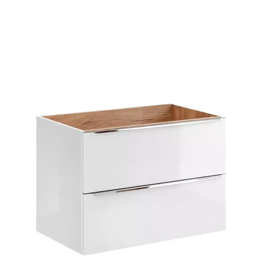 - Szeroka szafka pod umywalkę o szerokości 80 cm wyposażona w dwie pojemne szuflady umocowane na prowadnicach z mechanizmem cichego domykania.